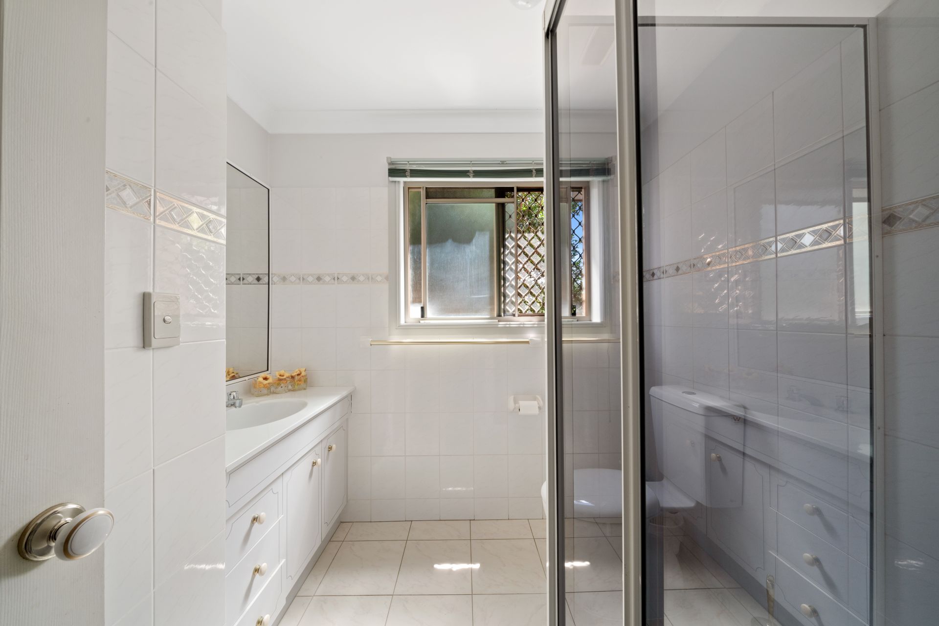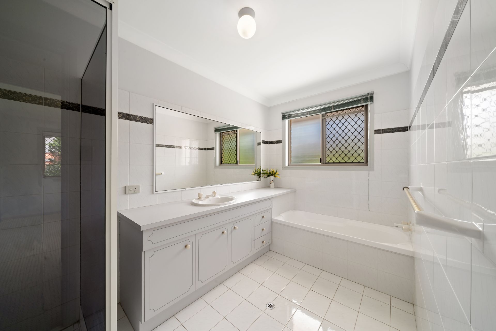 > The main bathroom located on the top level features shower, separate bath configuration, single basin vanity with plenty of storage and bench space, over-sized framed mirror, down-lighting, extractor fan, tiled flooring, sliding windows, towel rack and separate toilet.