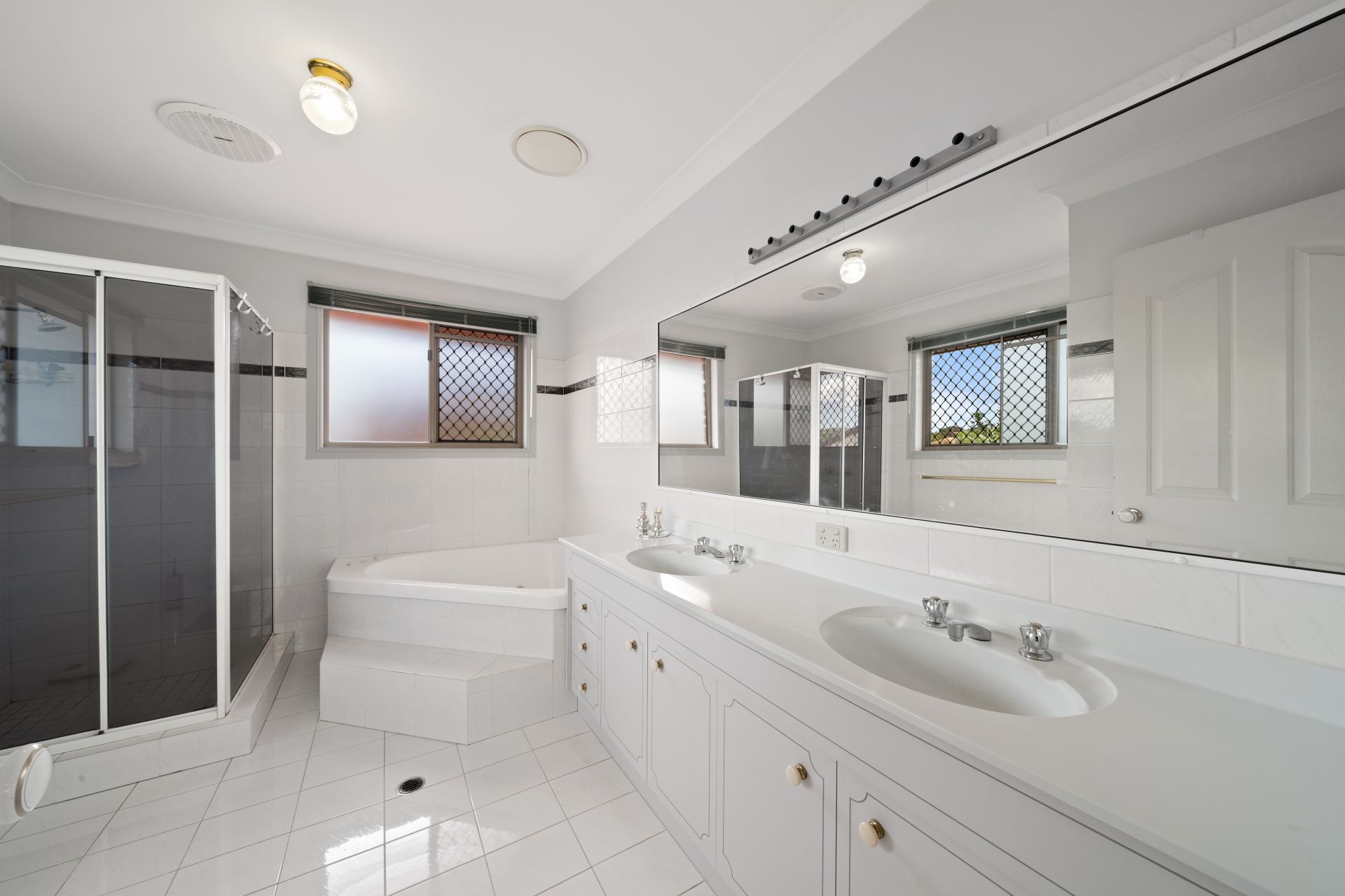 > The master ensuite located on the top level features tile flooring, shower, corner spa-bath, double basin vanity with plenty of storage, over-sized framed mirror, over vanity lights, down-lighting, extractor fan, sliding windows, towel rack and toilet.