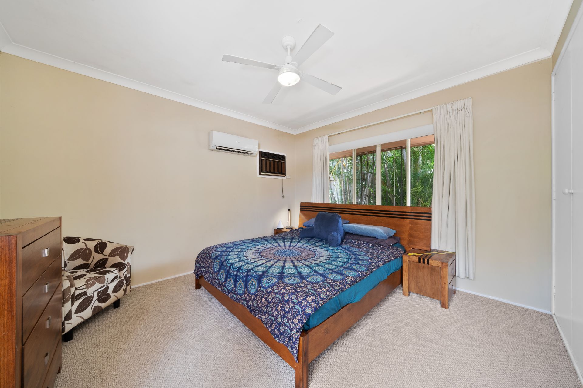 > The master is a light-filled space offering carpet flooring, Panasonic split-system air-conditioning, wall unit air-conditioning, ceiling fan/light combo, built-in robe, sliding windows with fly screens, security grills and curtains.