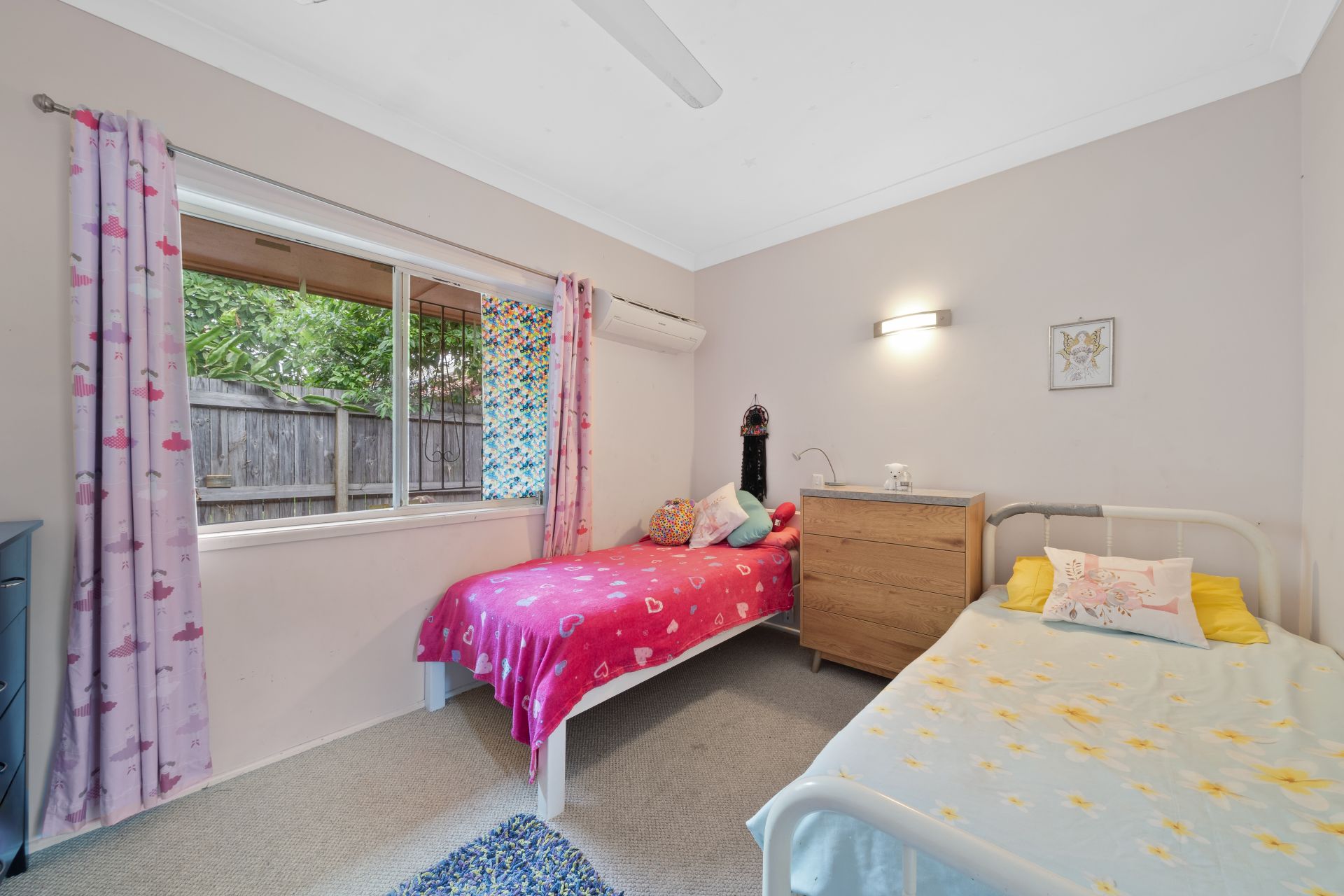 > Bedroom 2 features carpet flooring, Samsung air-conditioning, ceiling fan, wall lighting, sliding windows with fly screens, security grills and curtains.