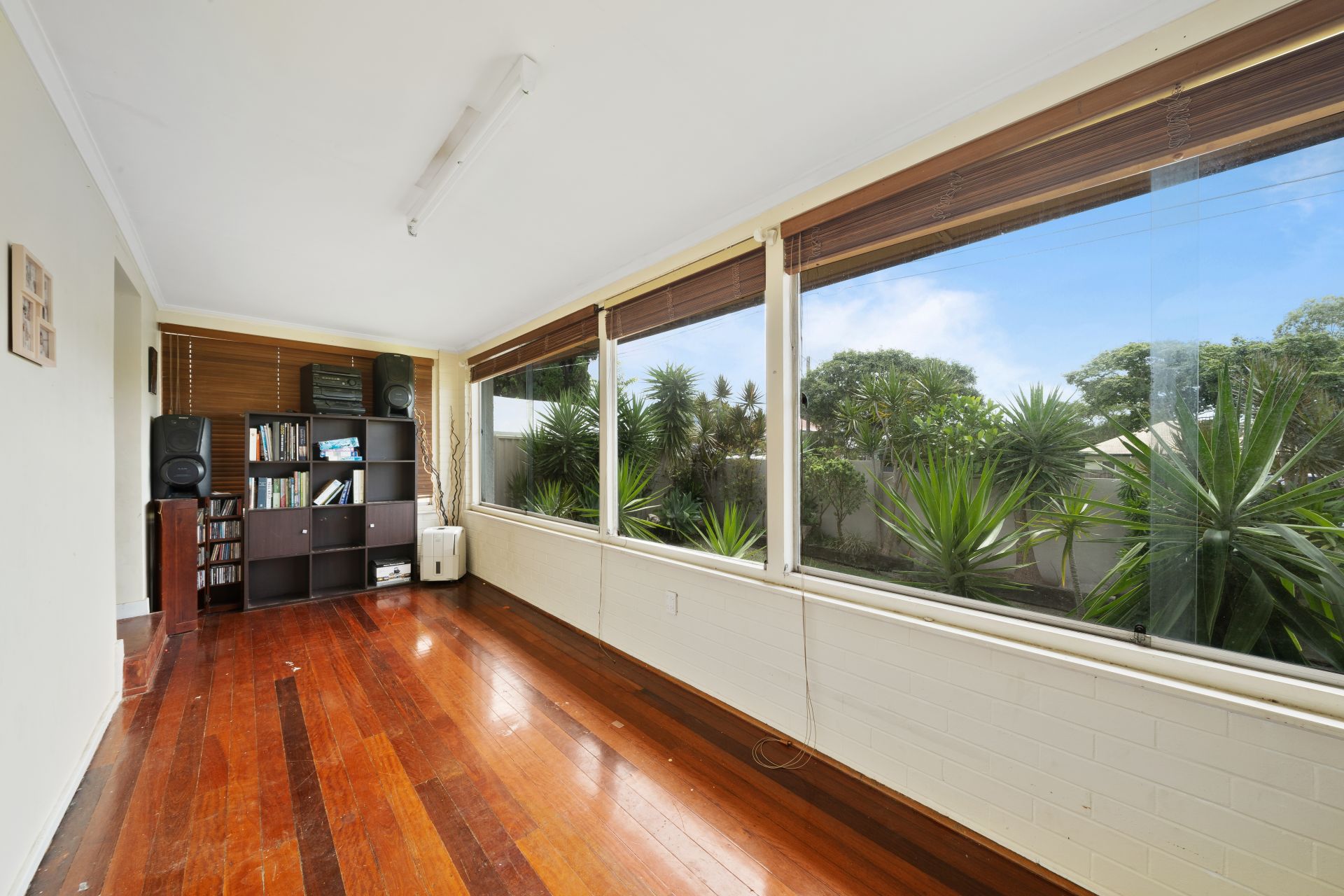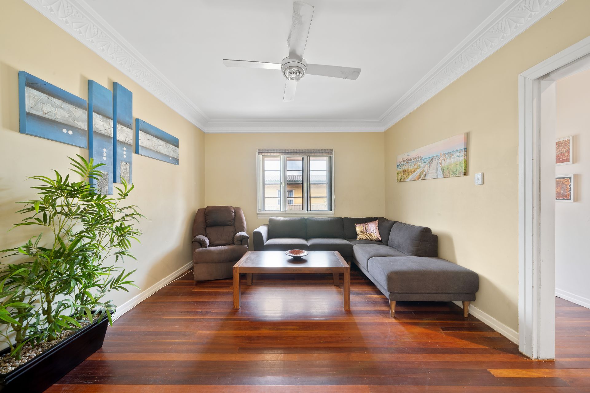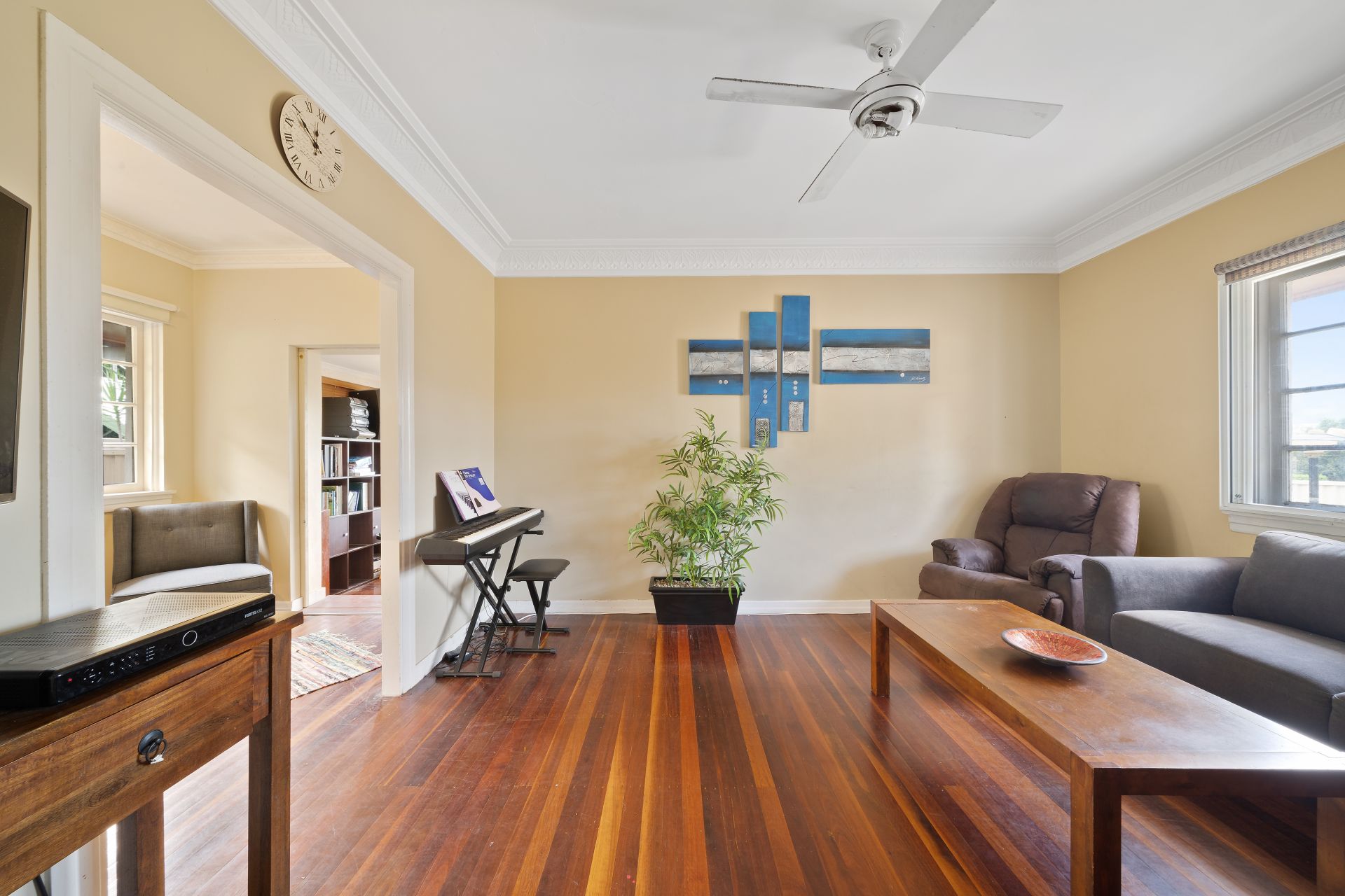 > The lounge flows effortlessly from the entrance of the home through to the study and sunroom. Featuring rich timber flooring, ornate cornicing, casement windows, roller blinds and ceiling fan/light combo.