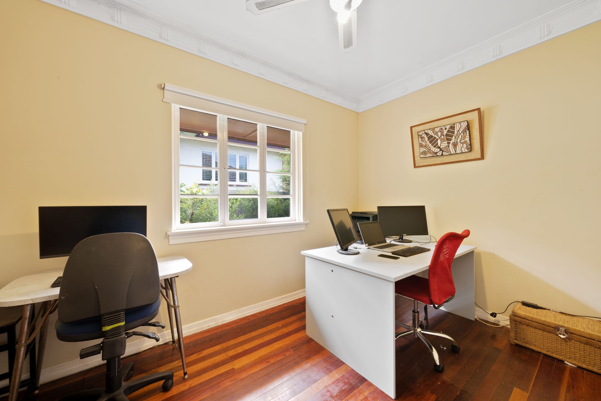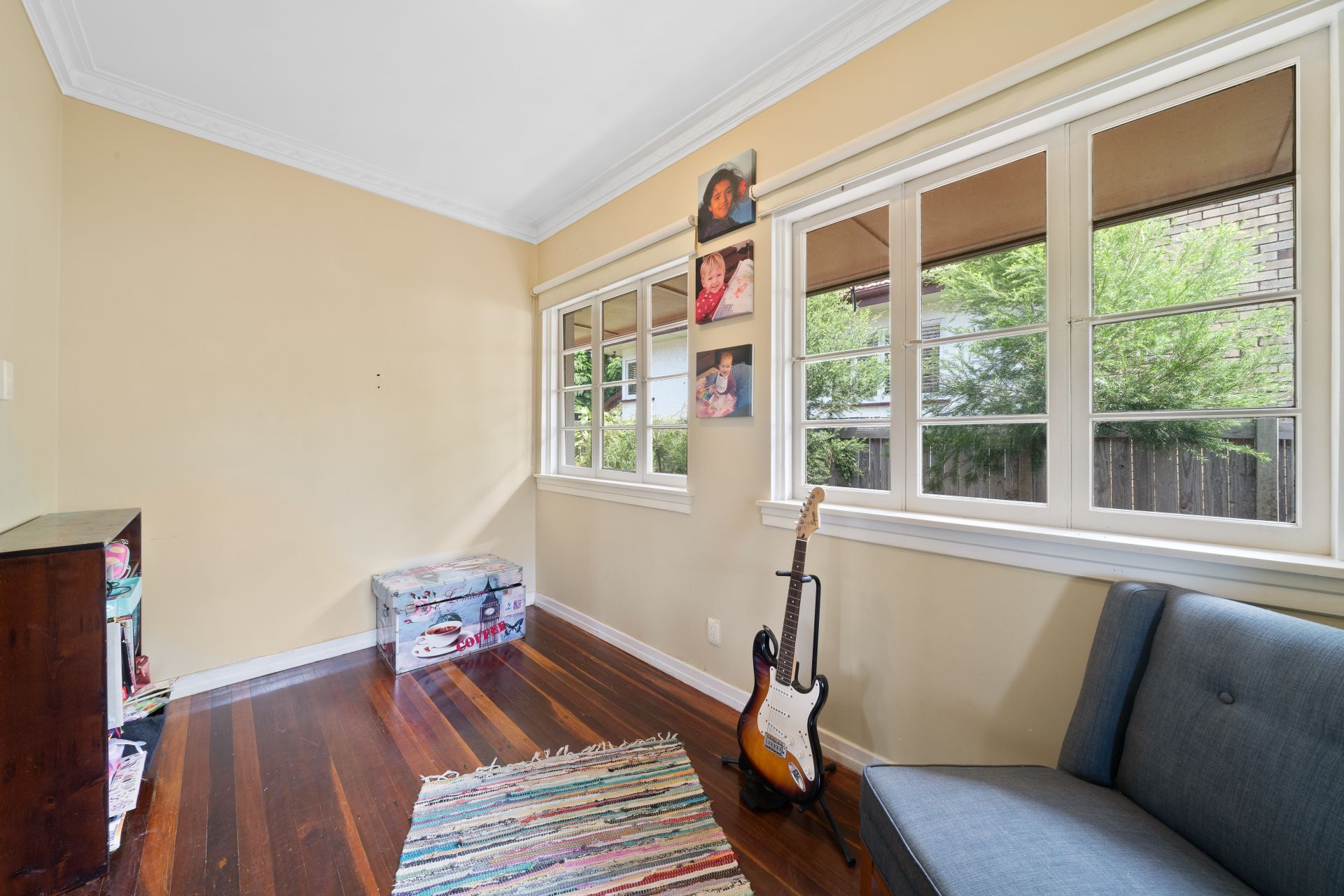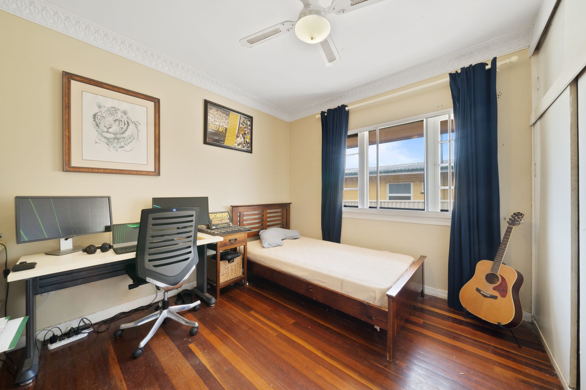 > Bedroom 3 features rich timber flooring, ornate cornicing, ceiling fan, casement windows and block out roller blinds.