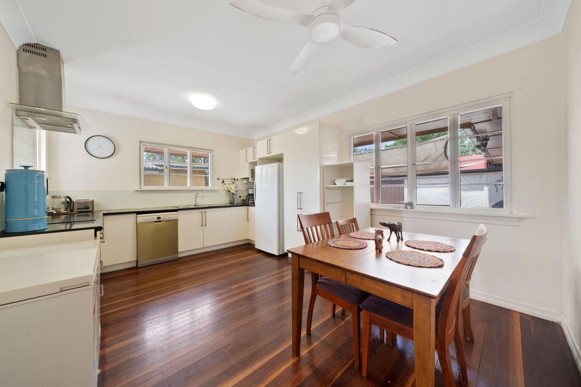 > Bedroom 4 features rich timber flooring, ceiling fan/light combo, ornate cornicing, built-in robe, casement windows and block out roller blinds.