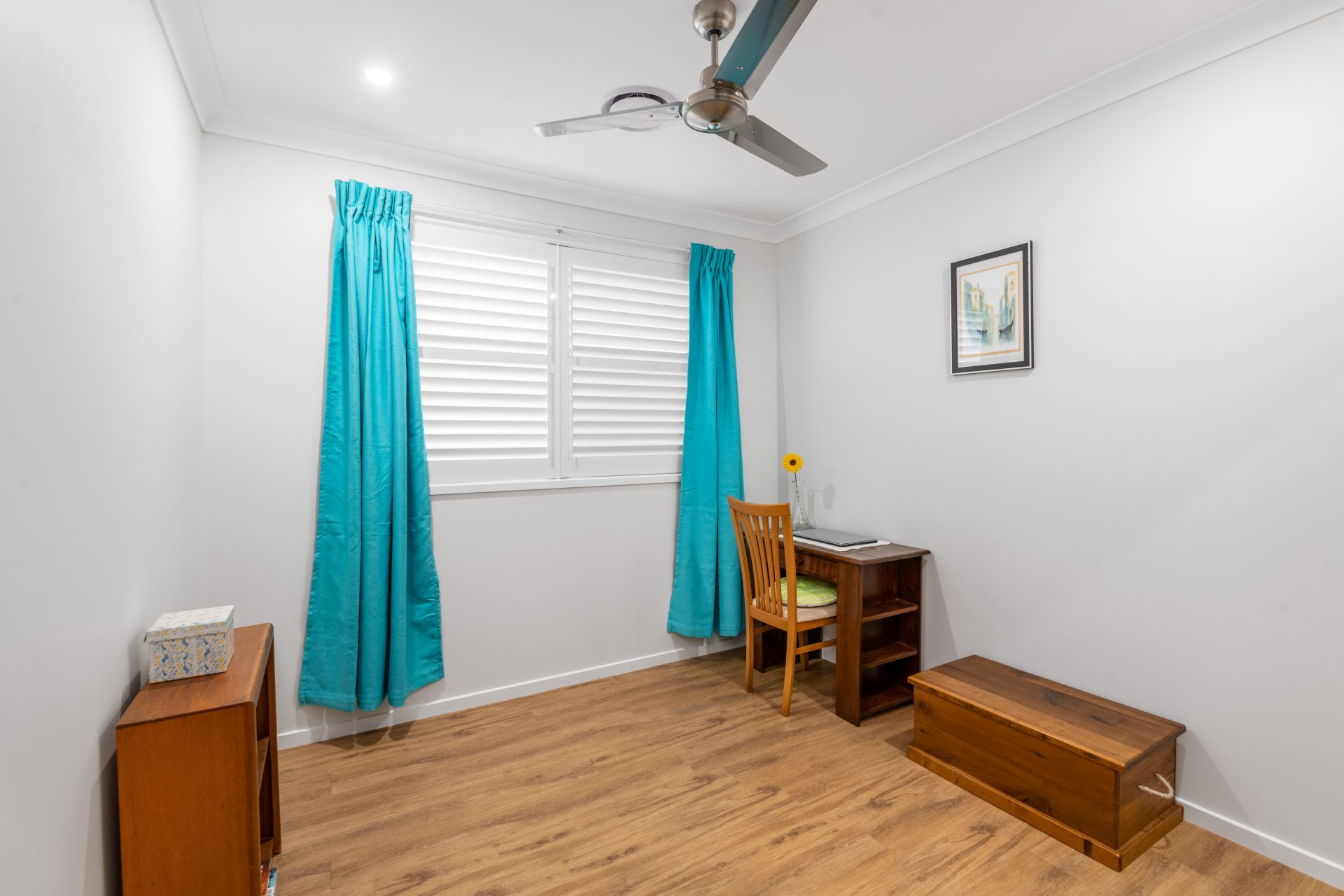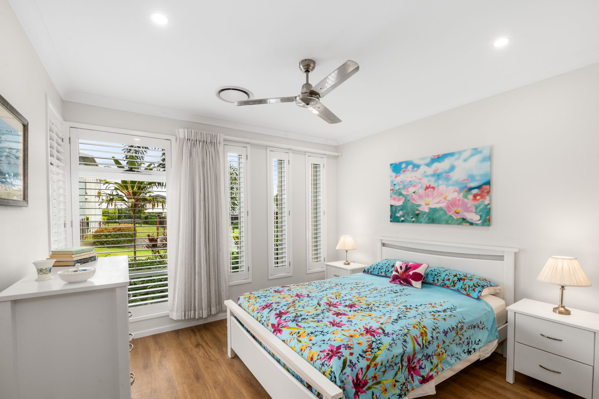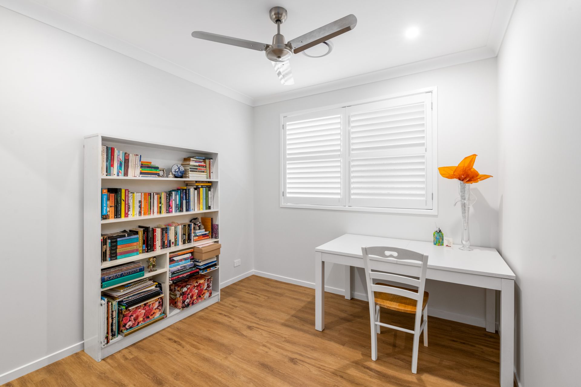 - Bedrooms two and three both feature timber-look flooring, ducted air-conditioning, stainless-steel ceiling fans, large built-in-robes with mirrored doors and plantation shutters.