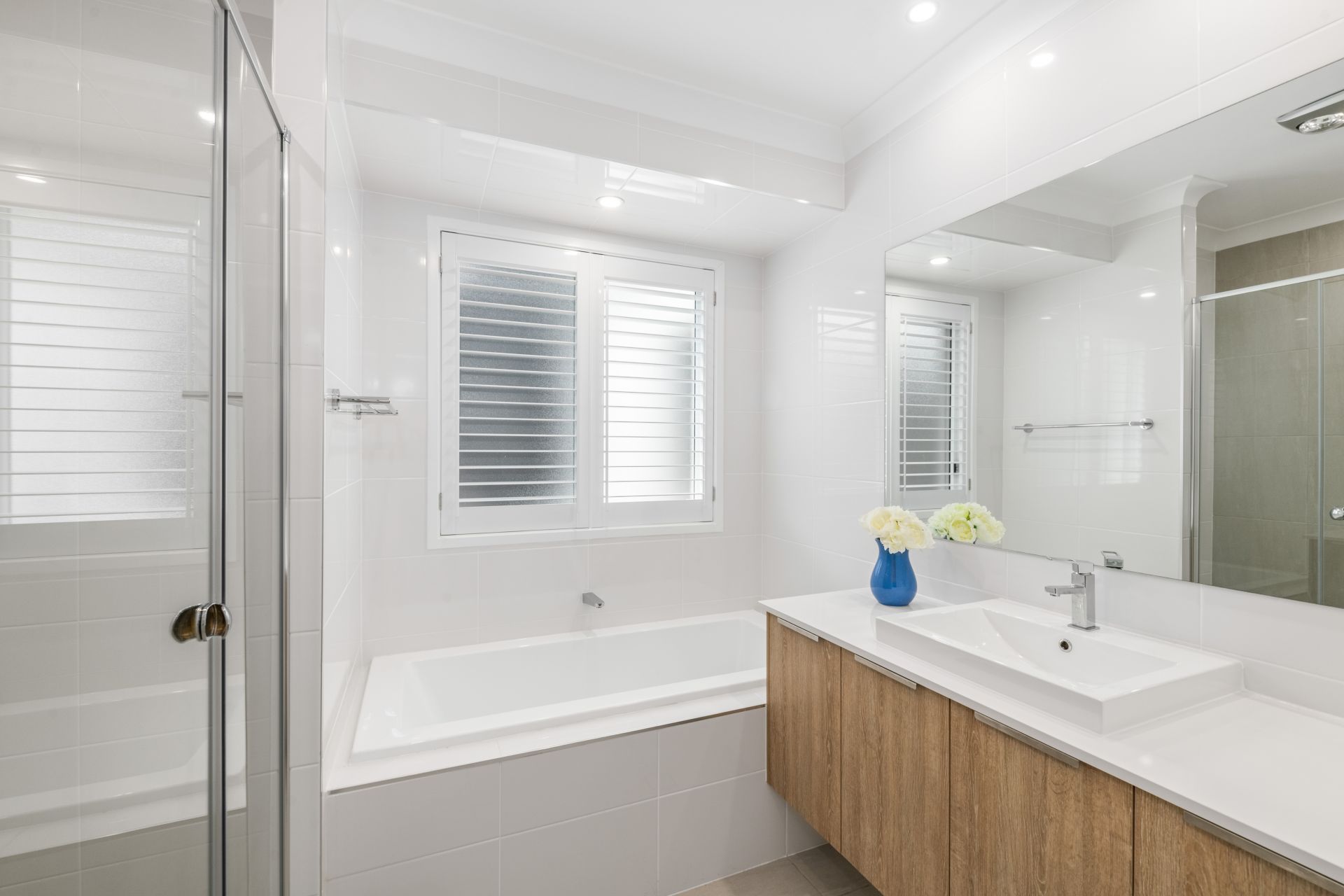 - Bathroom one is the home's beautiful main bathroom featuring tiled flooring, large double shower, separate deep-soaker bath, single vanity with stone benchtop, floor-to-ceiling tiles, plantation shutters and separate toilet.