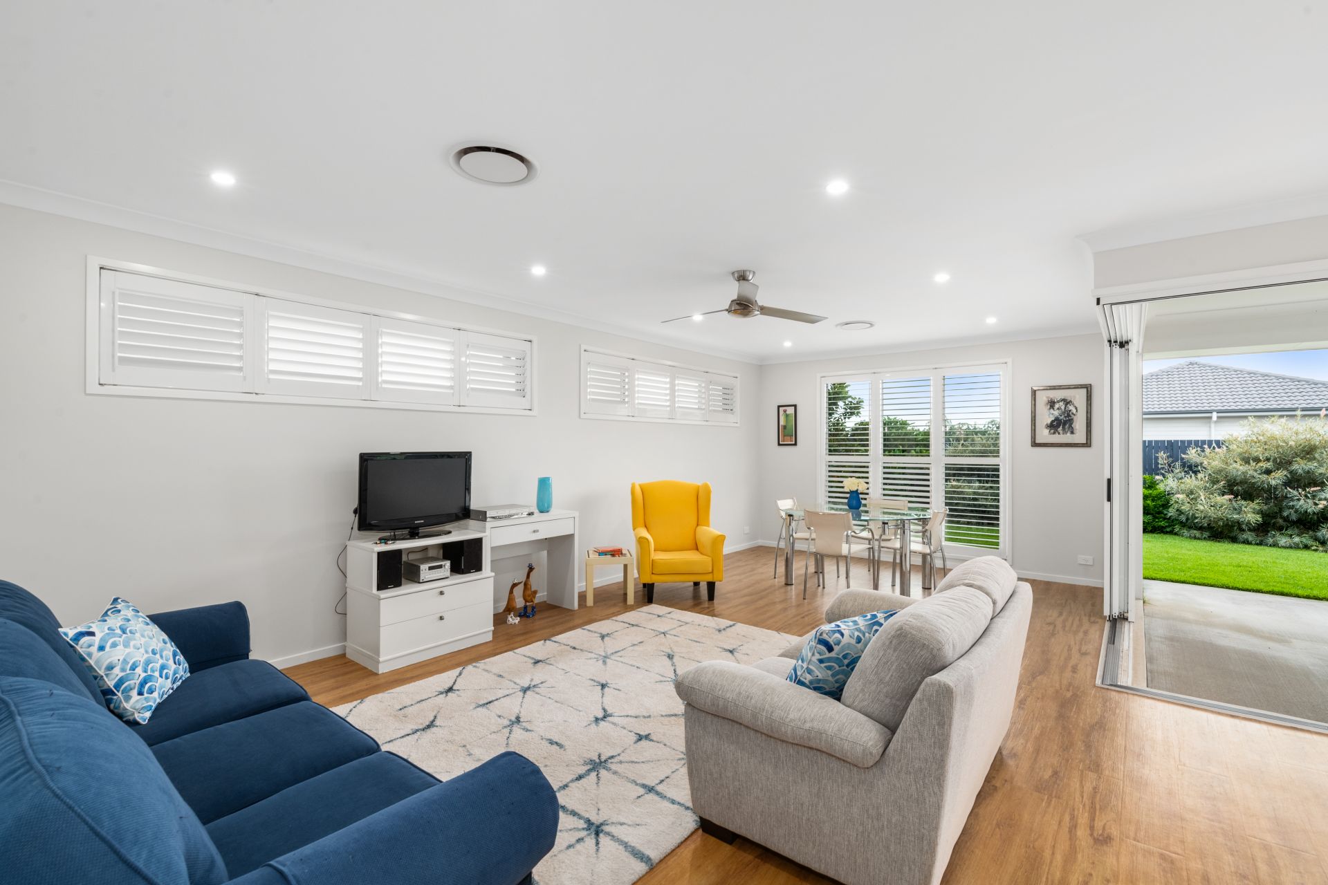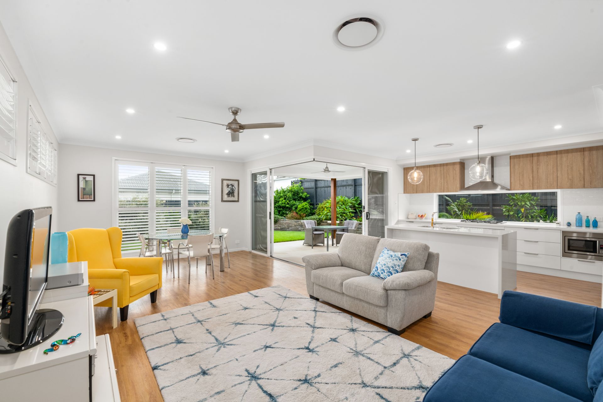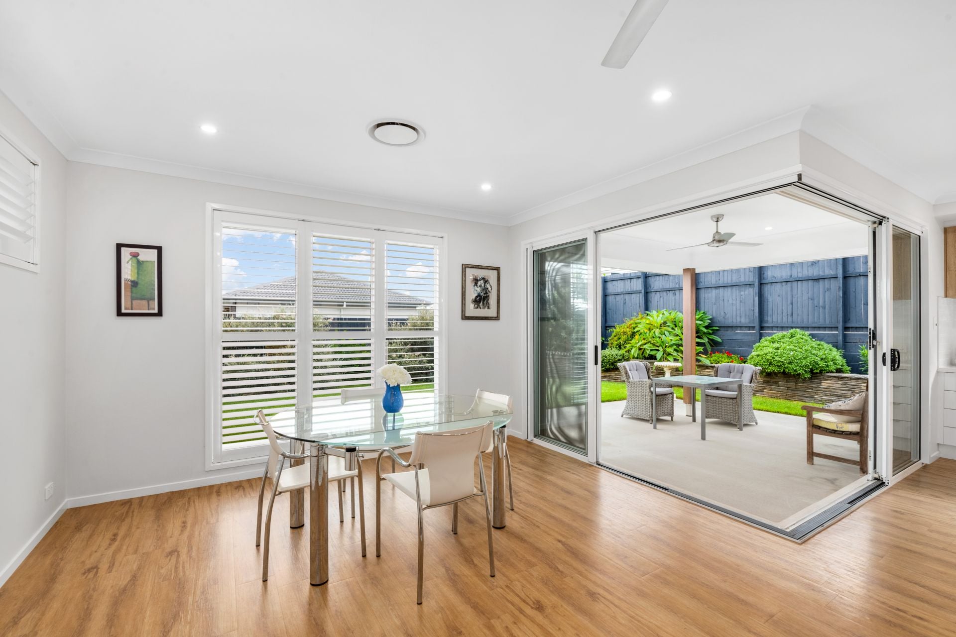 - Lounge room shares a large open space with the home's dining and kitchen. Overlooking the serene back yard, this room features timber-look flooring, ducted air-conditioning, stainless-steel ceiling fan, LED down-lights, plantation shutters and access to the covered entertaining area.