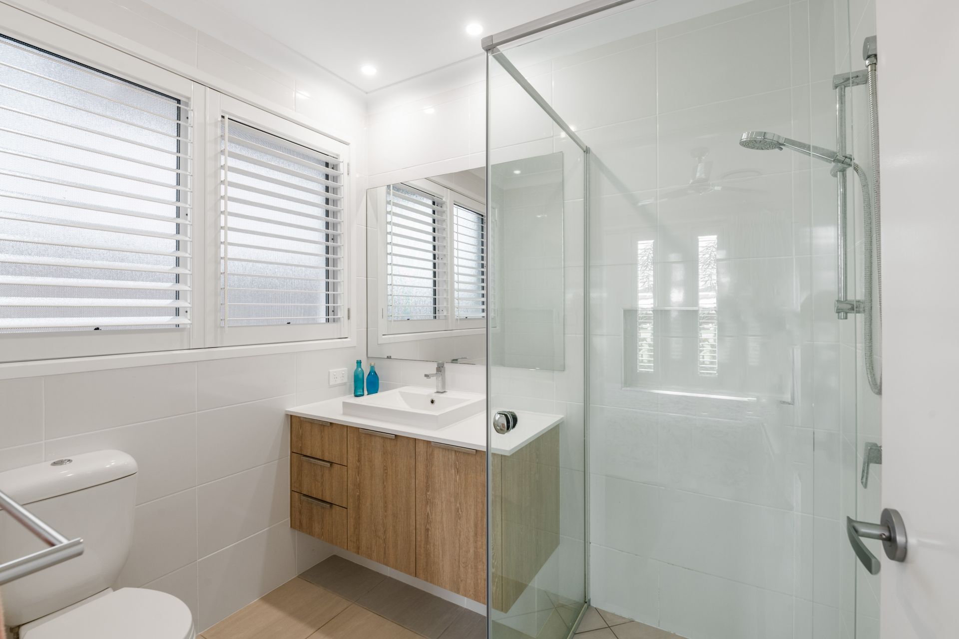- Bathroom two is the splendid ensuite to the master bedroom featuring tiled flooring, semi-frameless glass shower, single vanity with stone benchtop, floor-to-ceiling tiles, plantation shutters and toilet.