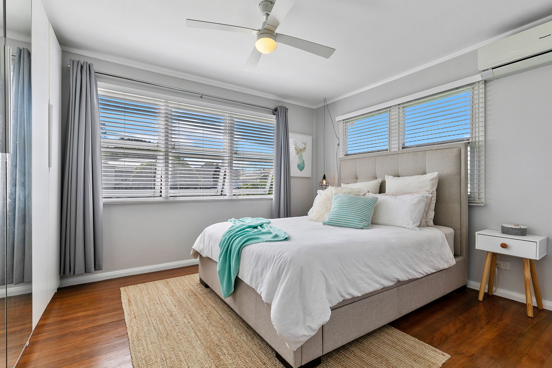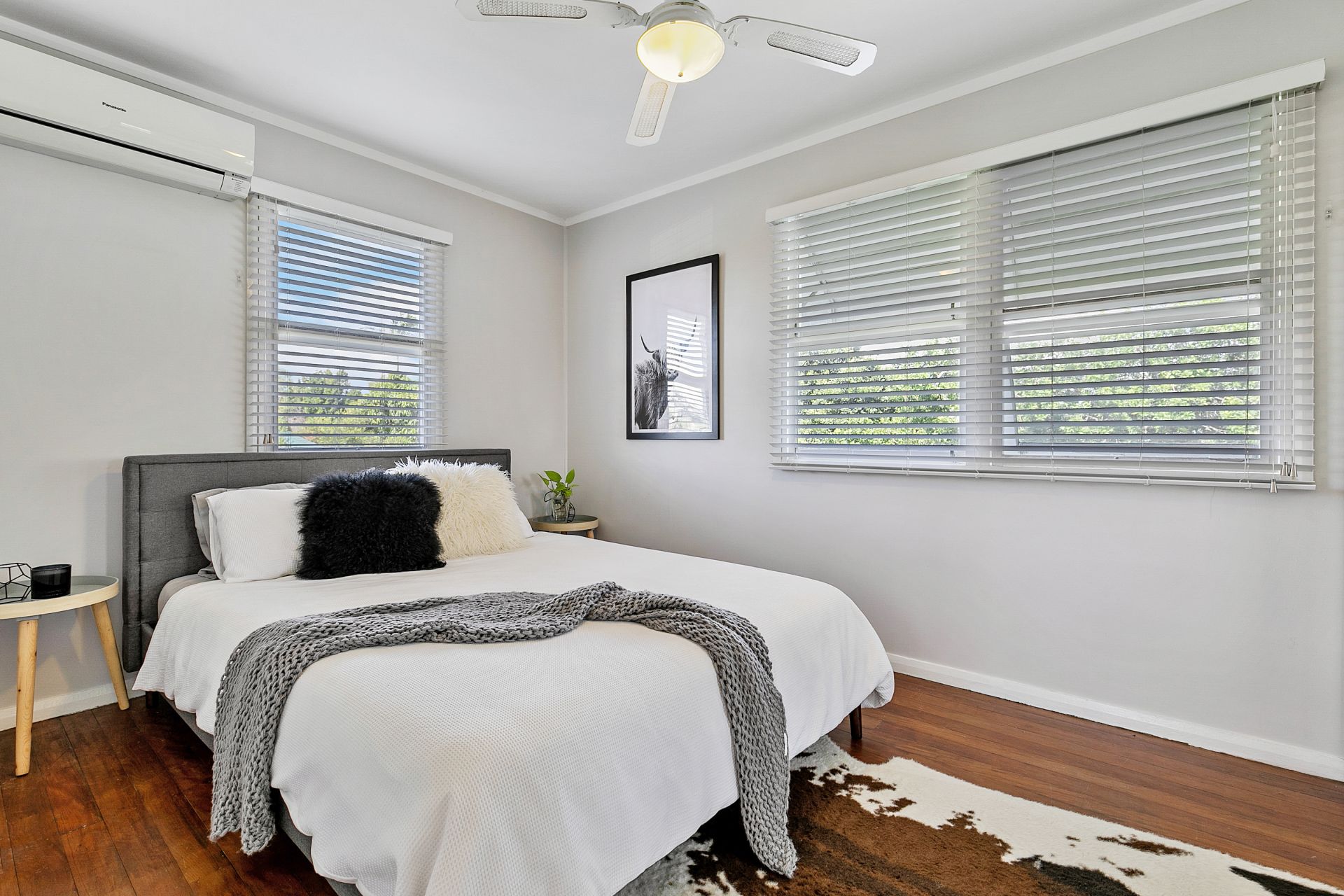 > Bedroom 2 features ceiling fan, air-conditioning, blinds, built-in-robe and timber floors