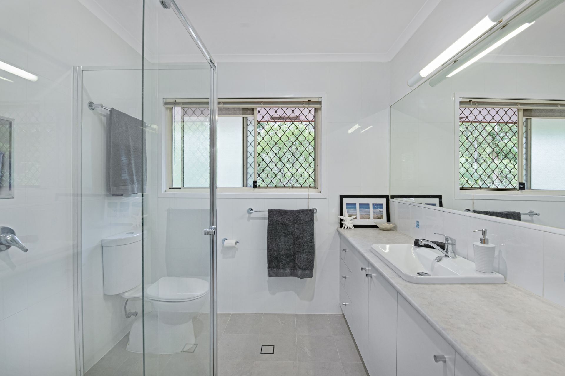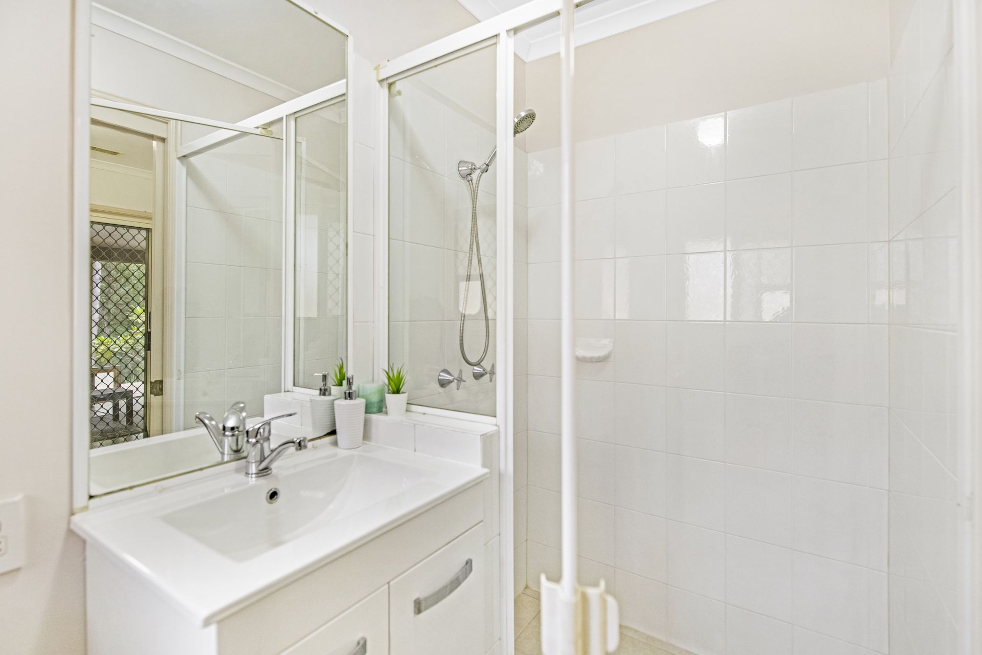 - Bathroom two is the renovated ensuite to the master bedroom. This bathroom features tiled flooring, over-sized shower with rainfall and detachable showerheads, single vanity, floor-to-ceiling tiles, views over the bushland reserve and toilet.