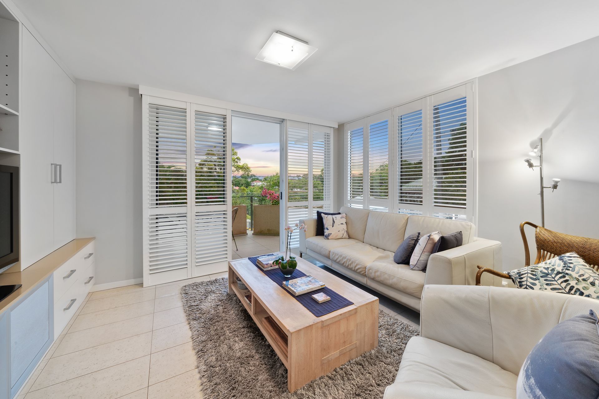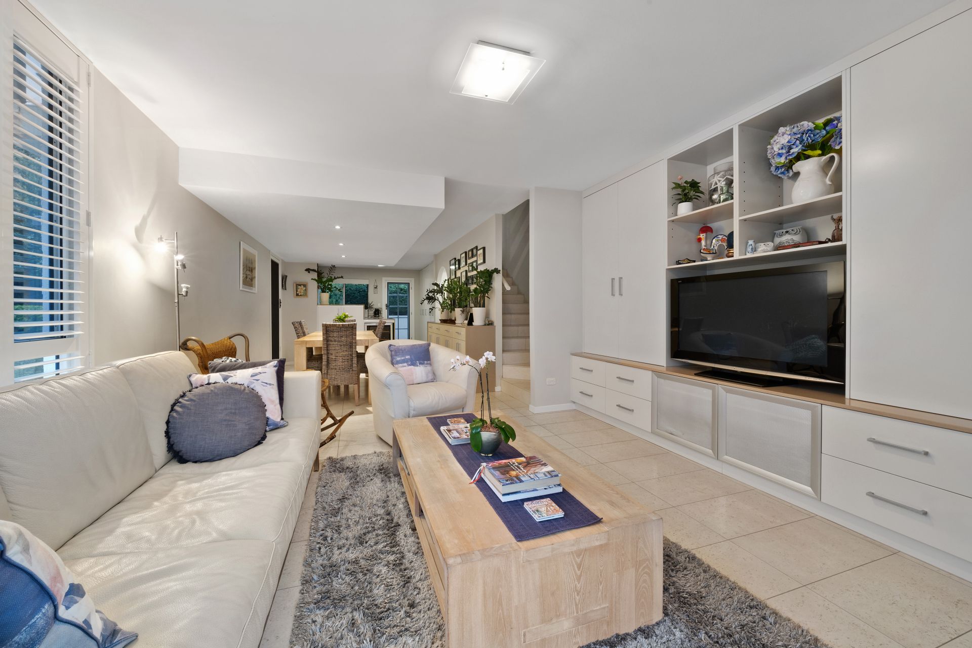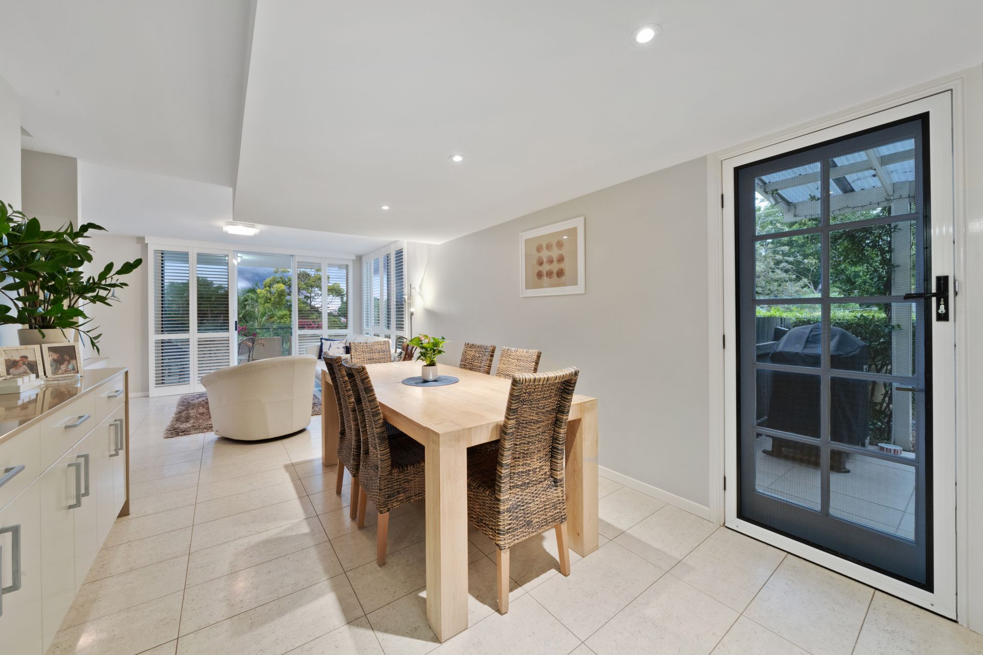 > The combined lounge/dining area, located in the heart of the home features tiled flooring creating a seamless flow from top to bottom, custom built-in buffet cabinet and entertaining unit, oyster + down-lighting, sliding windows with plantation shutters, entrance to the covered balcony overlooking the pool, security screens, and access semi covered outdoor entertaining patio area via the glass sliding door offering a seamless flow of living space.