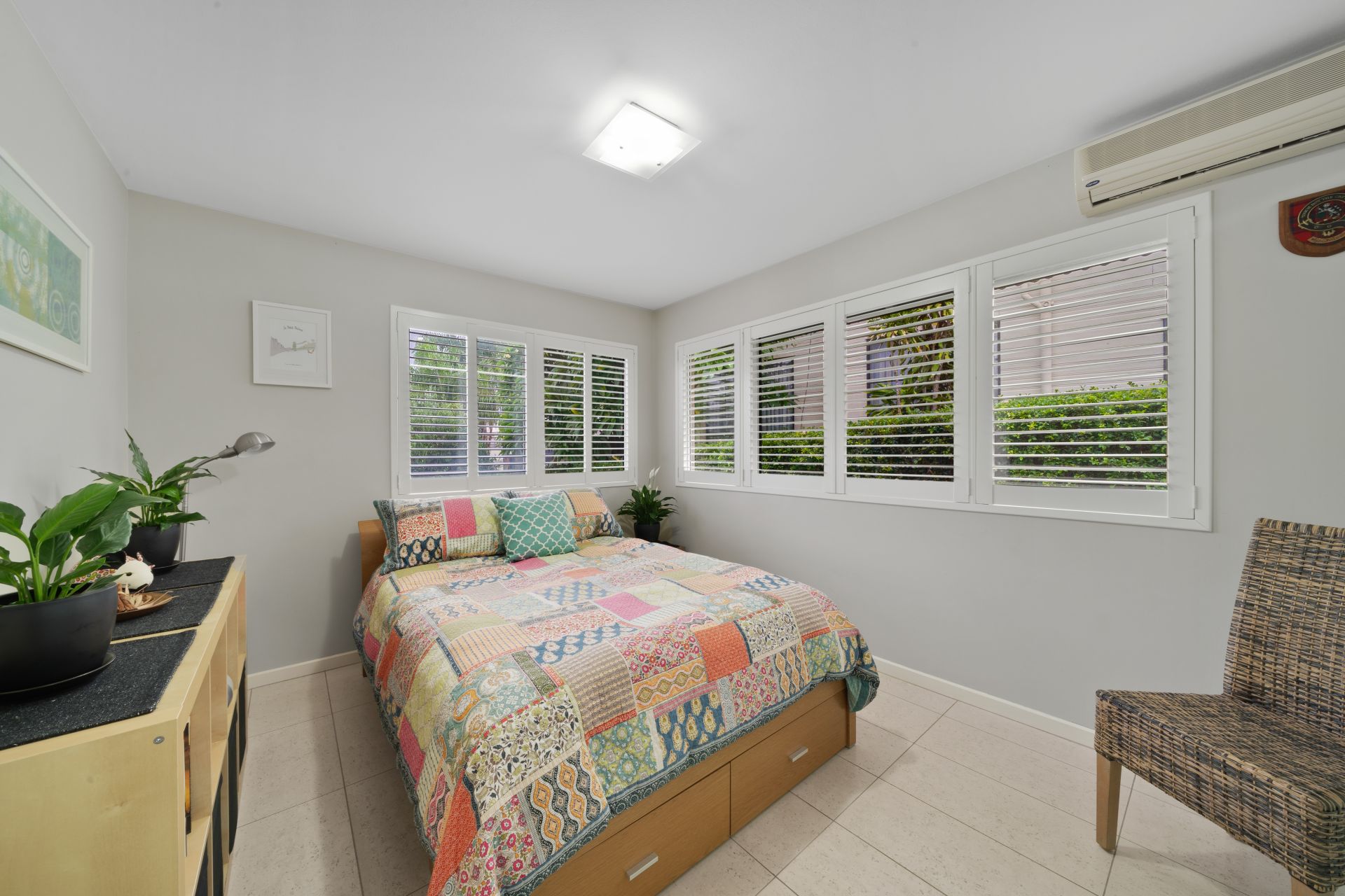 > Bedroom 2 features split system air-conditioning, tile flooring, large 3 door built-in-robe with custom cabinetry, plantation shutter, Crimsafe screens, traditional sliding windows and oyster lighting.