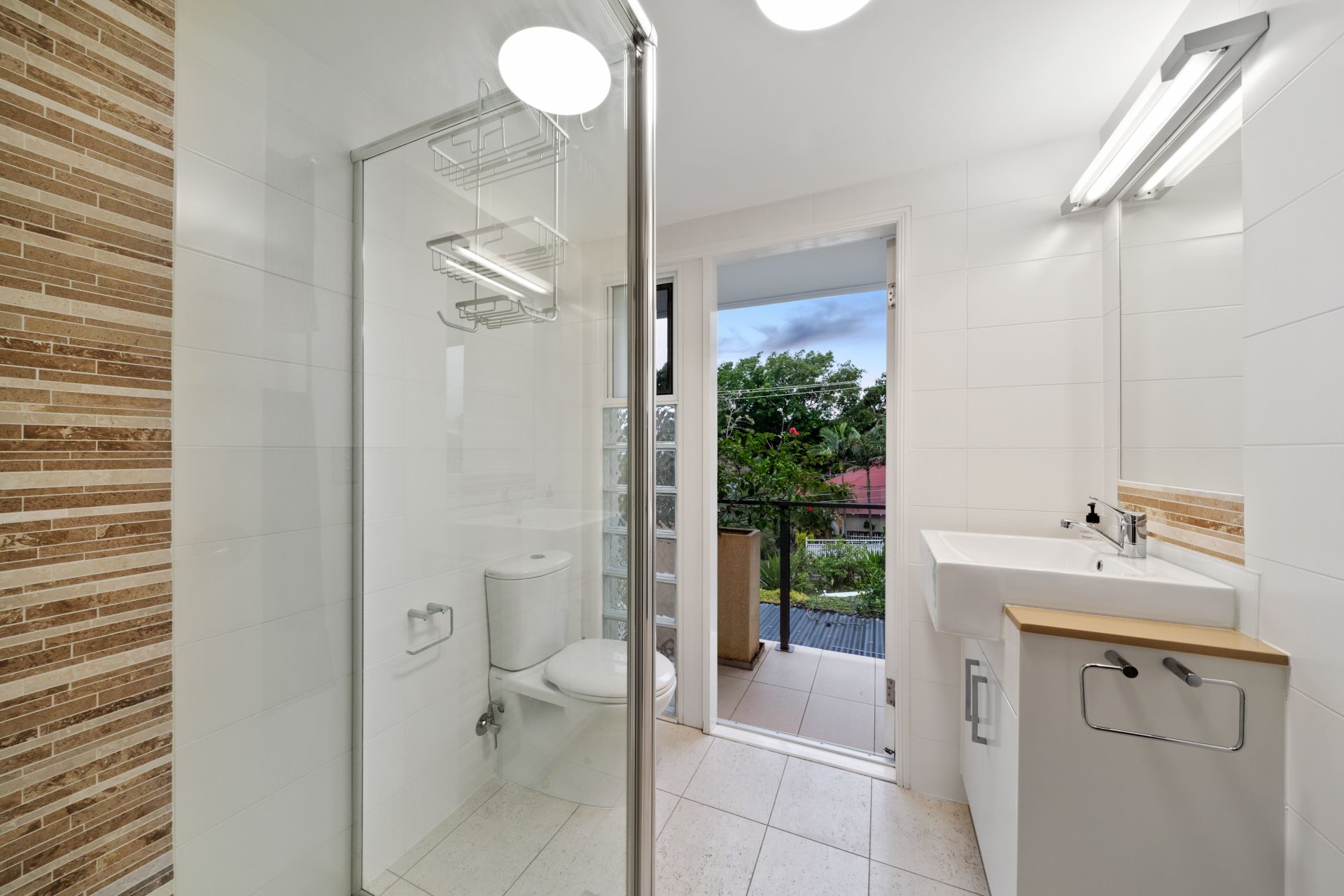 > The main bathroom located on the middle floor features a single basin vanity with plenty of storage, large vanity mirror, towel rails, semi frameless shower, toilet and access to the Juliet balcony overlooking the patio.