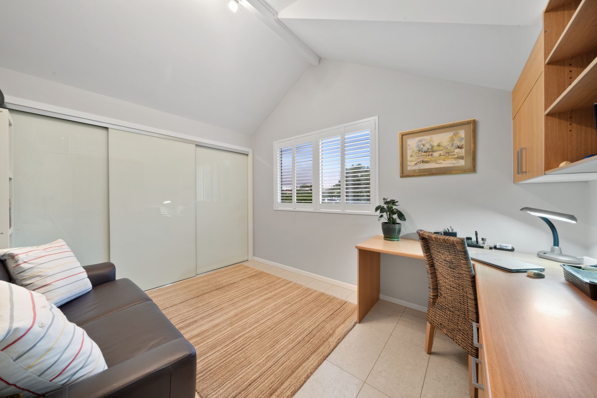 > Bedroom 3 located on the top floor features city views, window mounted air-conditioner, tile flooring, plantation shutter, fly screens, traditional sliding windows, large 3 door built-in-robe with custom cabinetry and built in office desk with storage.