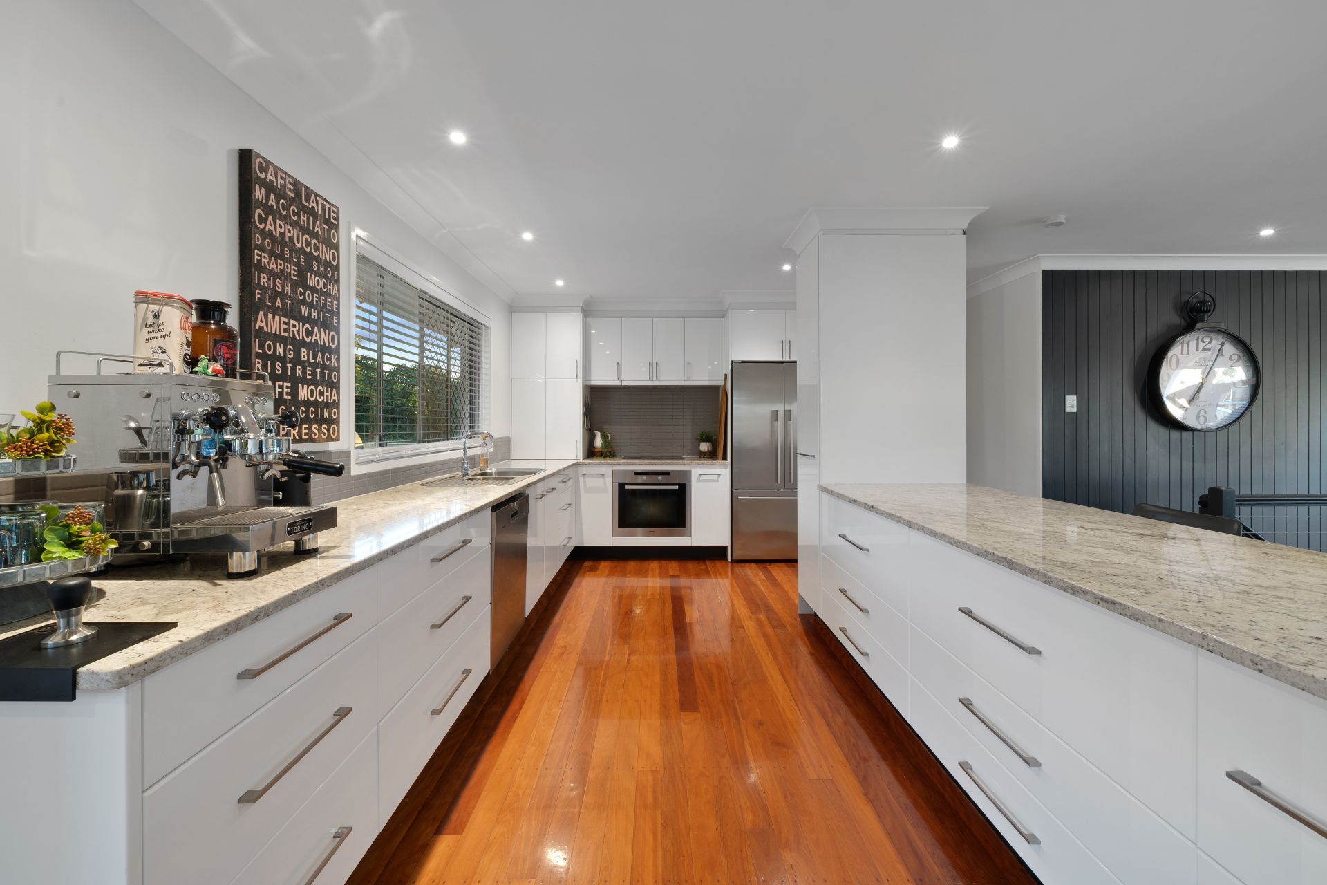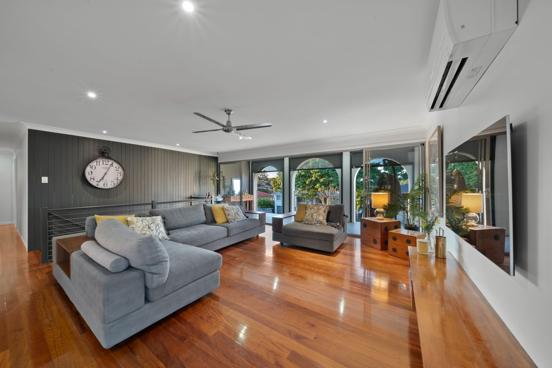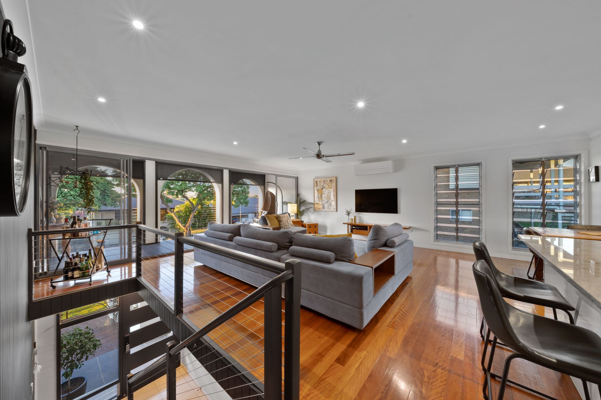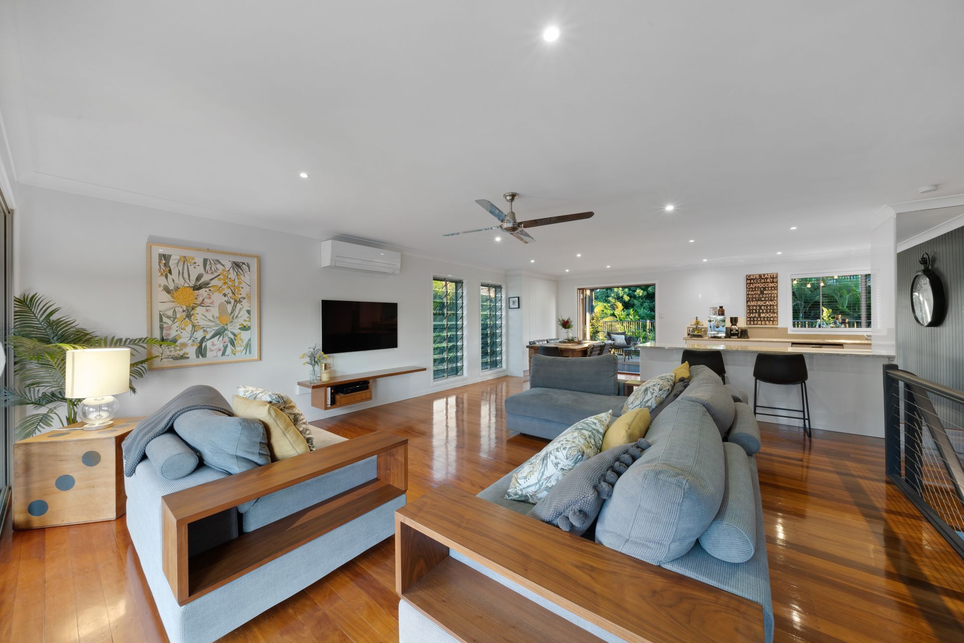 > The open plan main living/dining areas located at the heart of the home flow effortlessly to the kitchen and through to the dual top level outdoor entertaining areas. The light and contemporary colour scheme adds to the expansive nature of the home, featuring Mitsubishi air-conditioning, down-lighting, rich timber flooring, custom cabinetry, louvre windows and a combination of glass French doors + bank of glass sliding doors.
