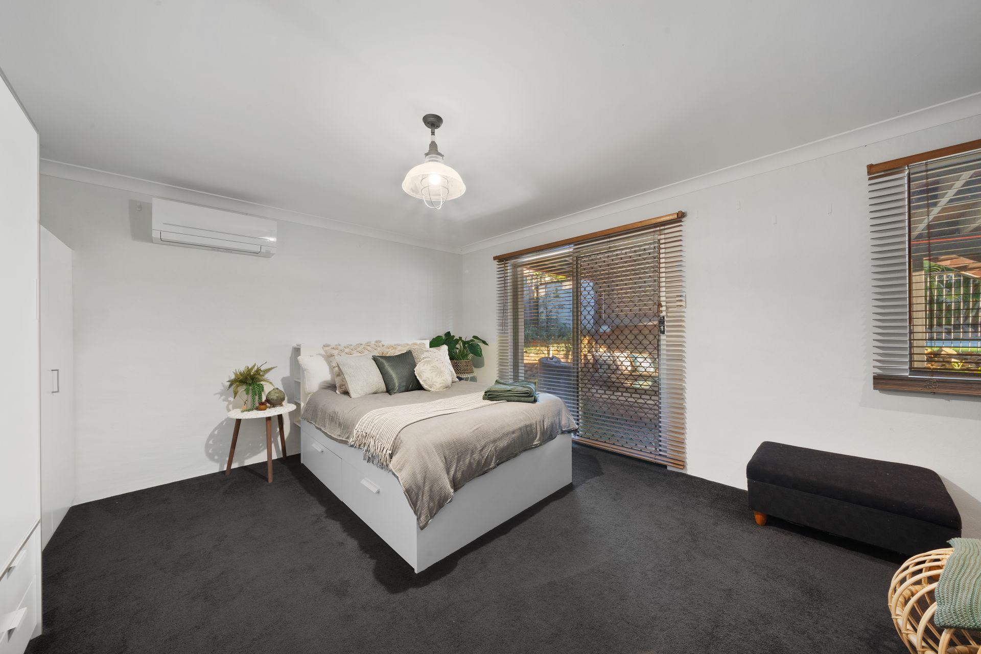 > Located on the entry level bedroom 5 enjoys Mitsubishi air-conditioning, carpet flooring, pendant + down-lighting, venetian blinds, sliding window and large glass sliding door giving you access to the lower level outdoor entertaining area.