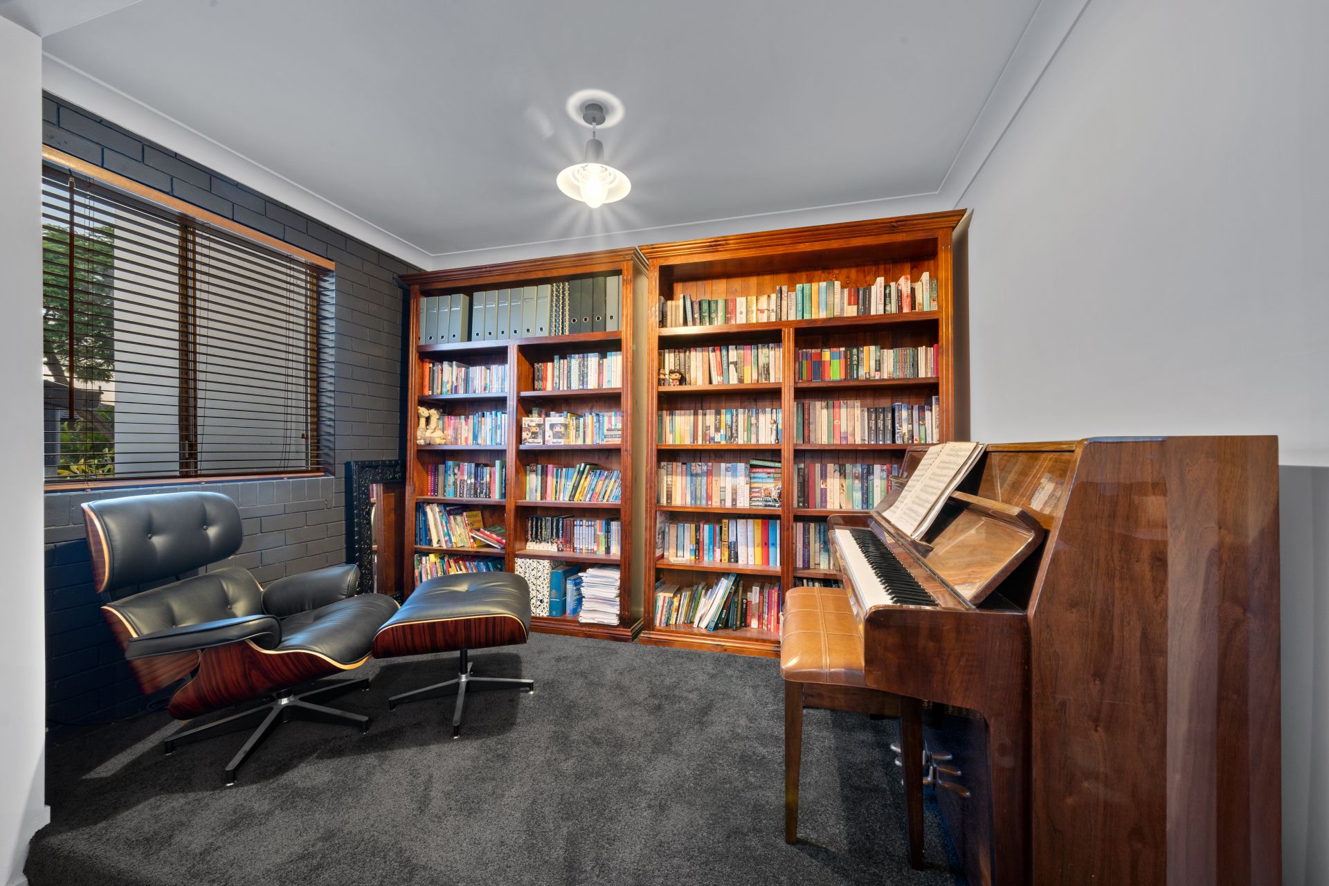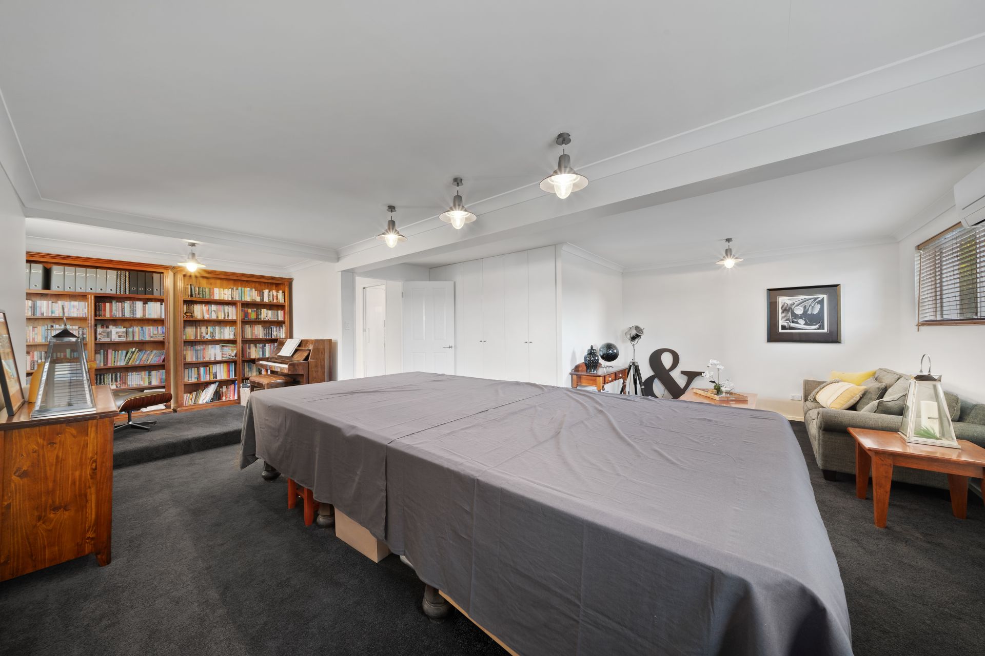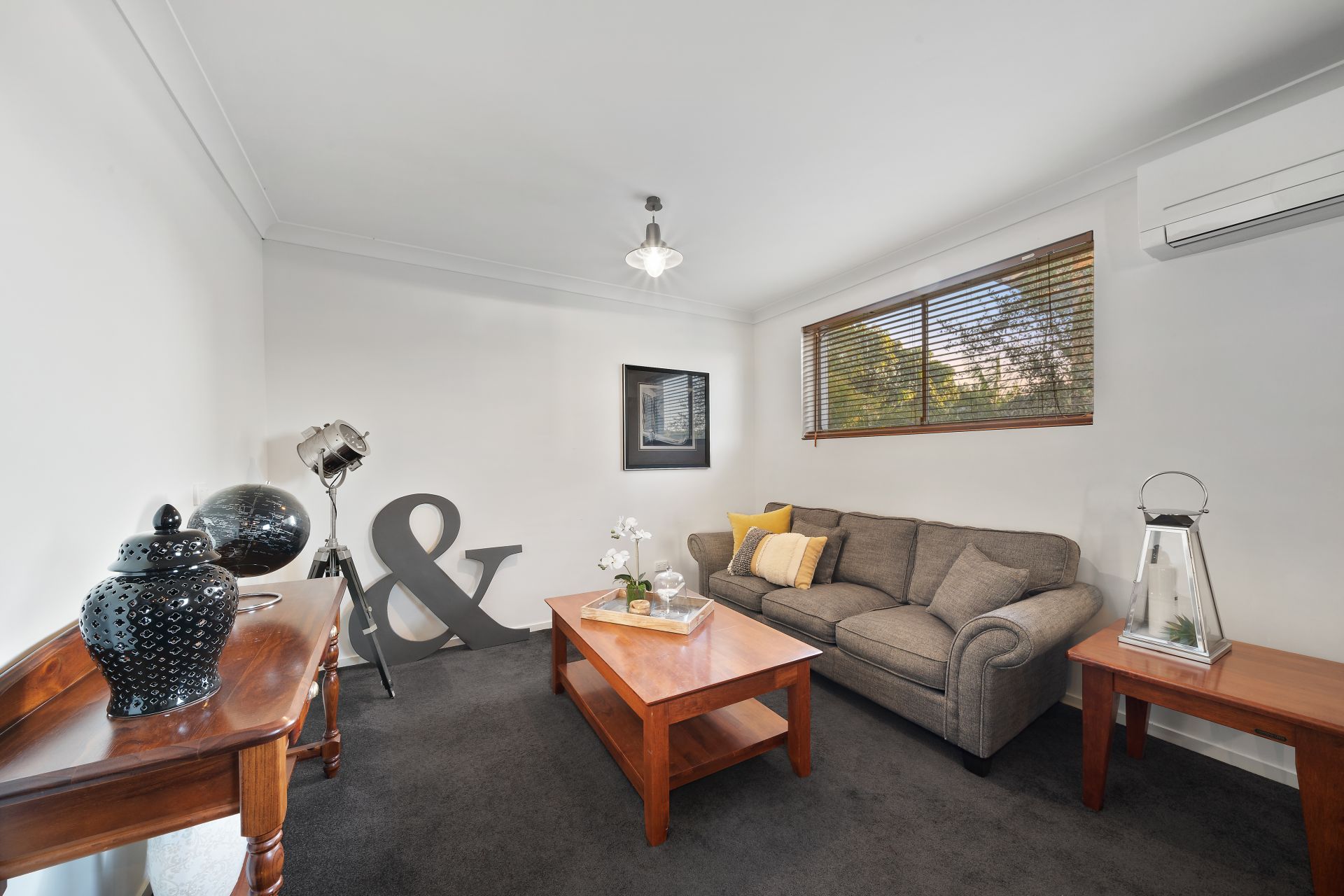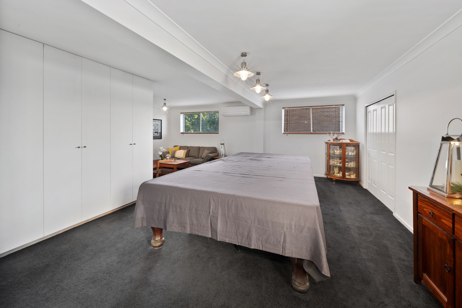 > Located on the entry level is the second living room featuring Mitsubishi air-conditioning, pendant lighting, carpet flooring, venetian blinds, sliding windows, custom cabinetry and access to the 2 way storage (access from garage).