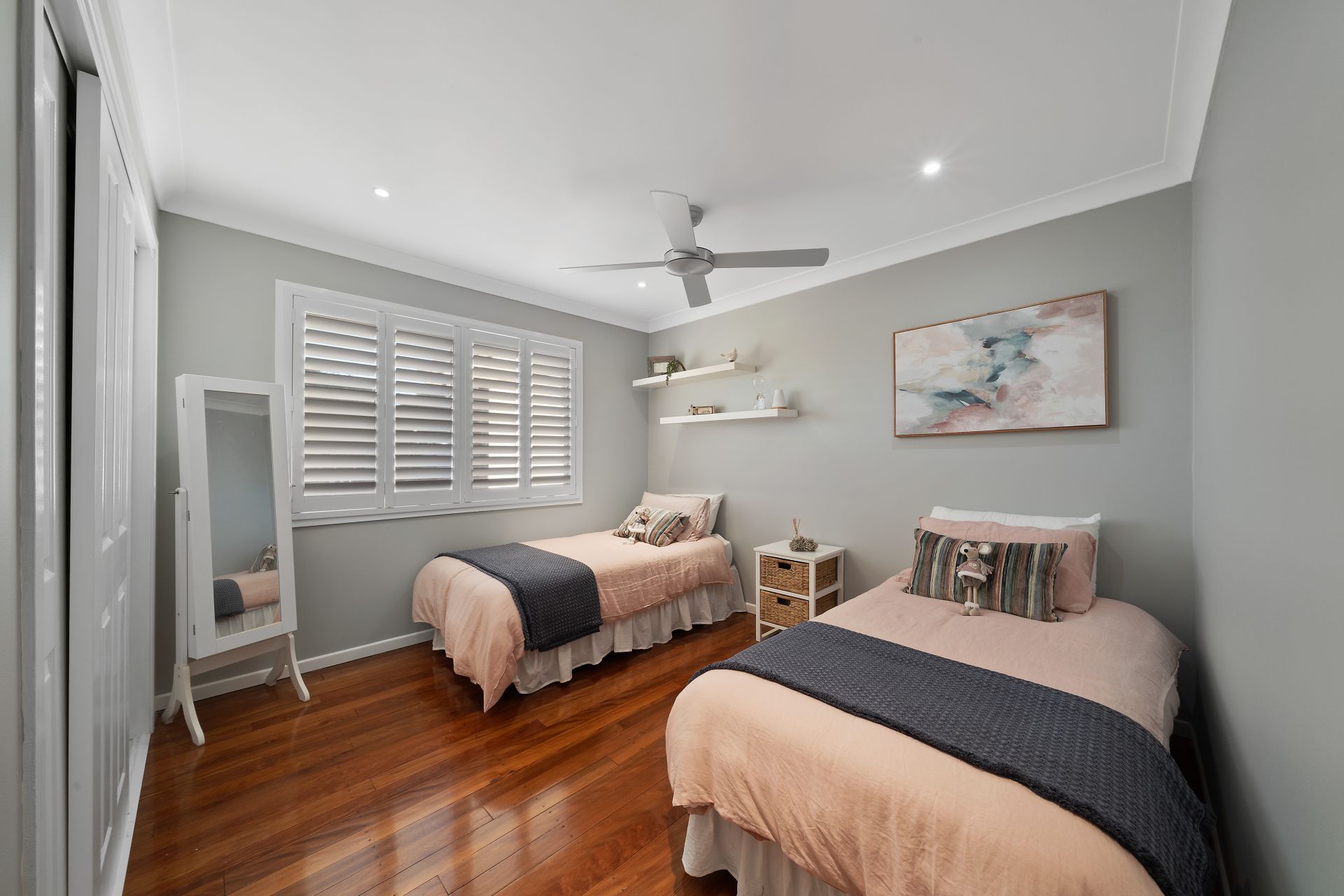 > Located on the top level bedrooms 2 and 3 enjoy built-in-robes, rich timber flooring, down-lighting, ceiling fans and sliding windows with plantation shutters.