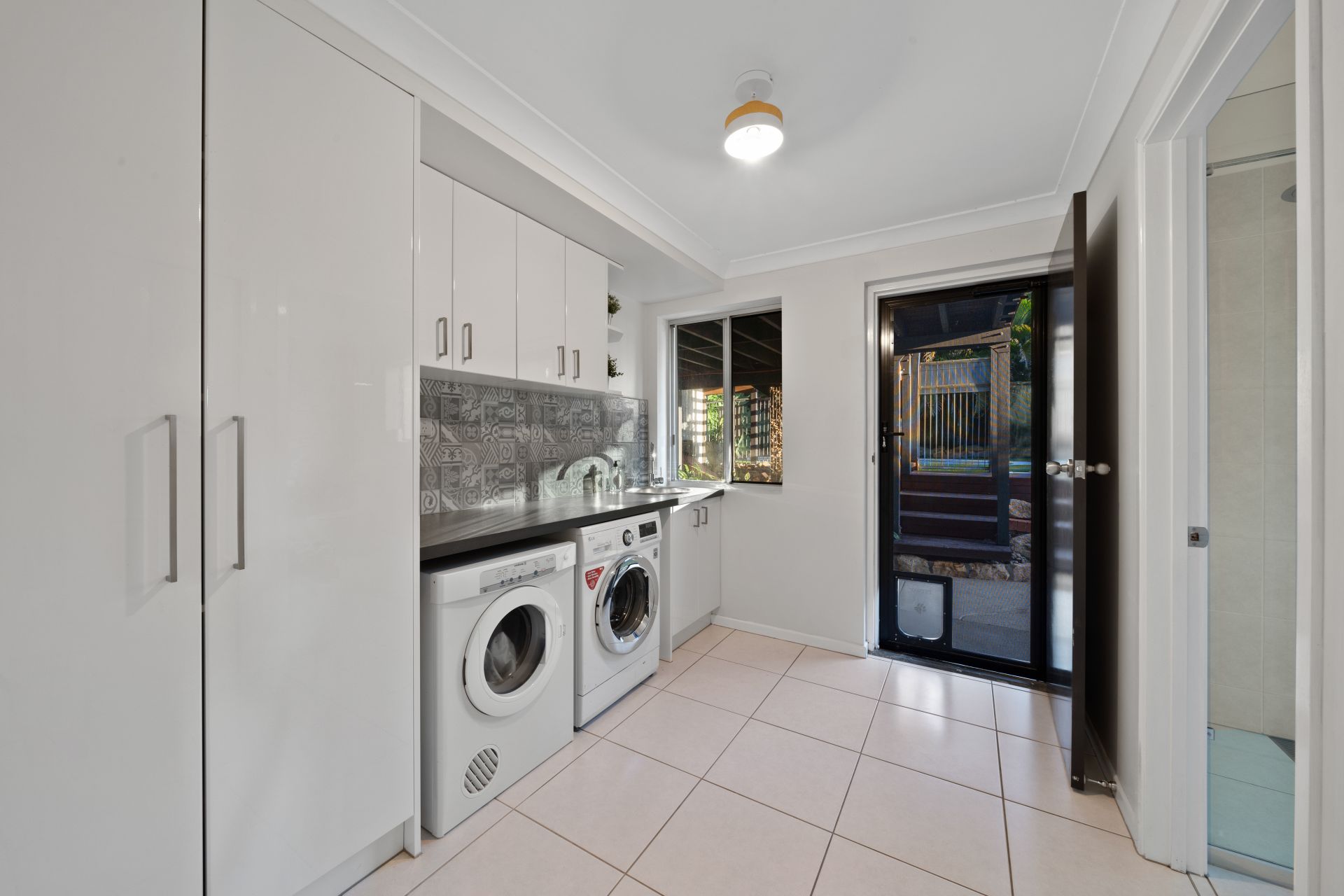 - The laundry located on the entry level features wash tub, Laminex bench tops, custom cabinetry, laundry chute and separate access to the yard + entertaining areas.