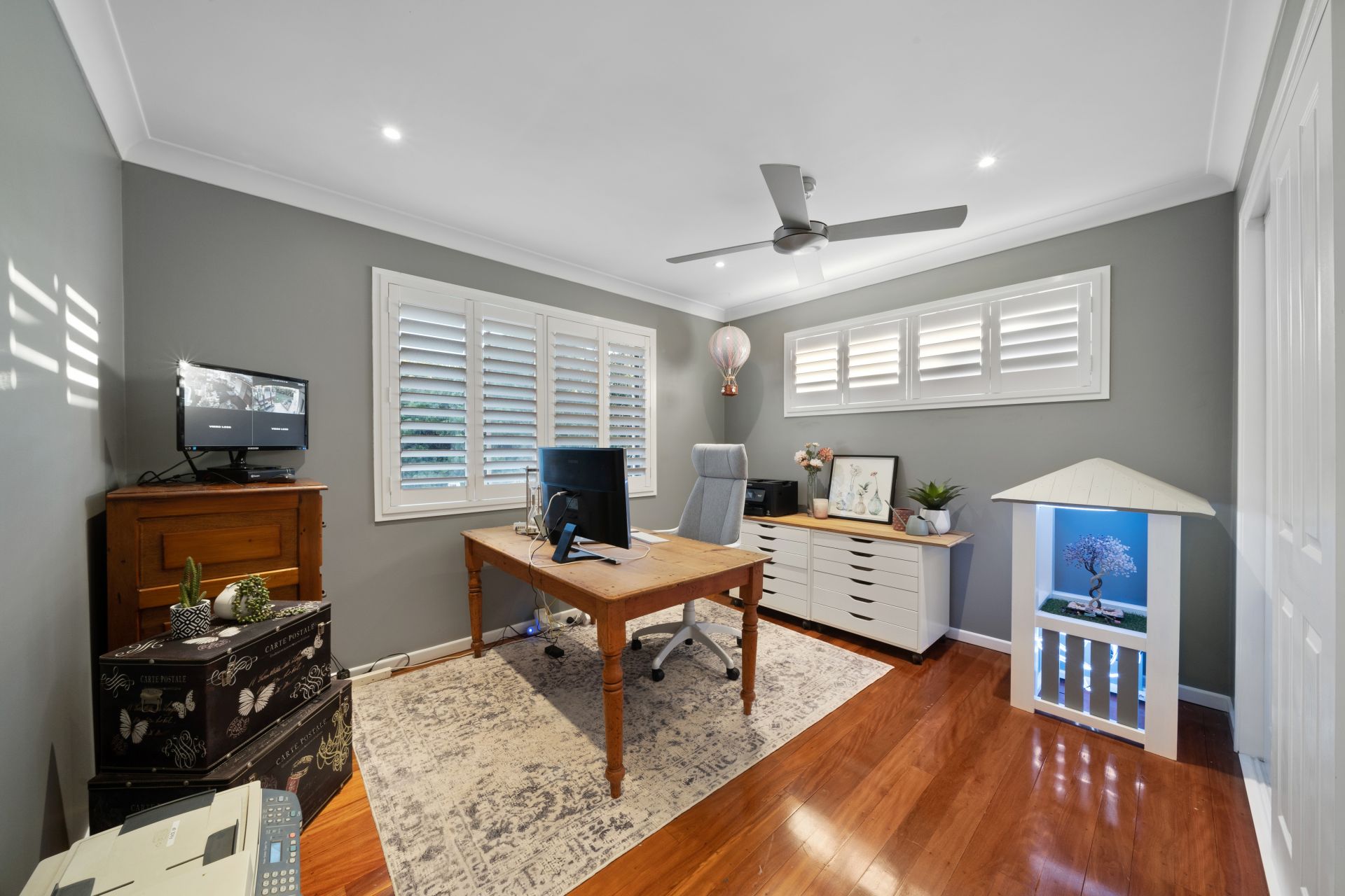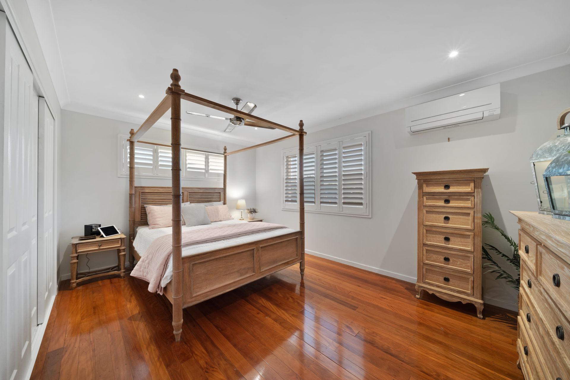 > Located on the top level the master is perfect for those who enjoy their own space, boasting Mitsubishi air-conditioning, rich timber flooring, built-in robe, down-lighting, ceiling fan and sliding windows with plantation shutters.