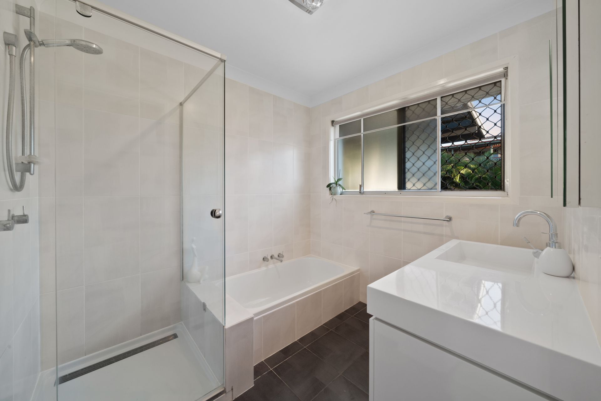 > The main bathroom located on the top level features chic floor-to-ceiling tiles, shower with detachable showerhead, bath, single basin vanity with plenty of storage, mirror faced medicine cabinets, extractor/heat/light combo, towel rack, sliding window, roller blind and separate toilet.