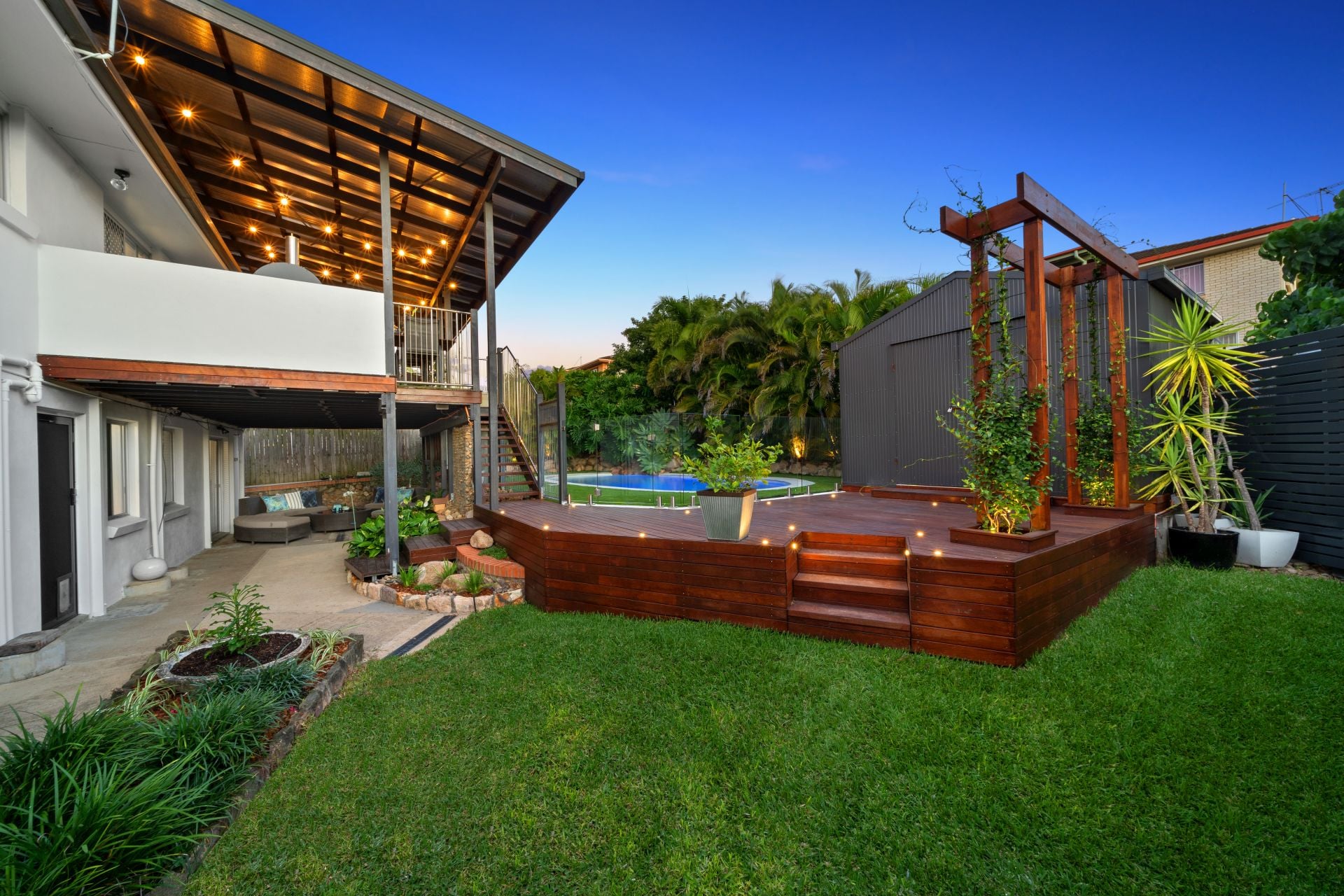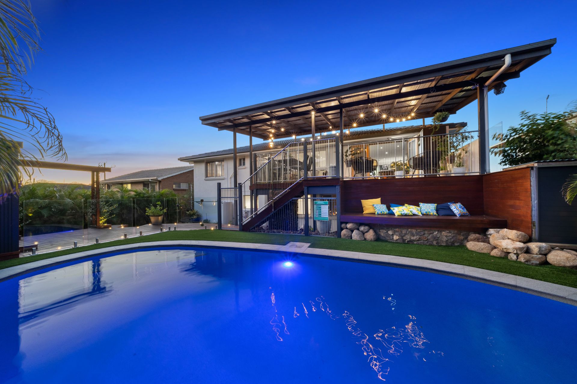 - Outdoor entertaining will be a breeze thanks to the many options this property provides from the large front balcony featuring tiled flooring, roll-down privacy shades, outdoor lighting and power point to the over-sized elevated covered rear deck featuring outdoor lighting and power point, with access to the lower level outdoor entertaining area located directly under the rear deck, complimented by the glistening in-ground pool, landscaped gardens and fully fenced kid/pet friendly yard, encapsulates everything there is to love about our Queensland lifestyle.