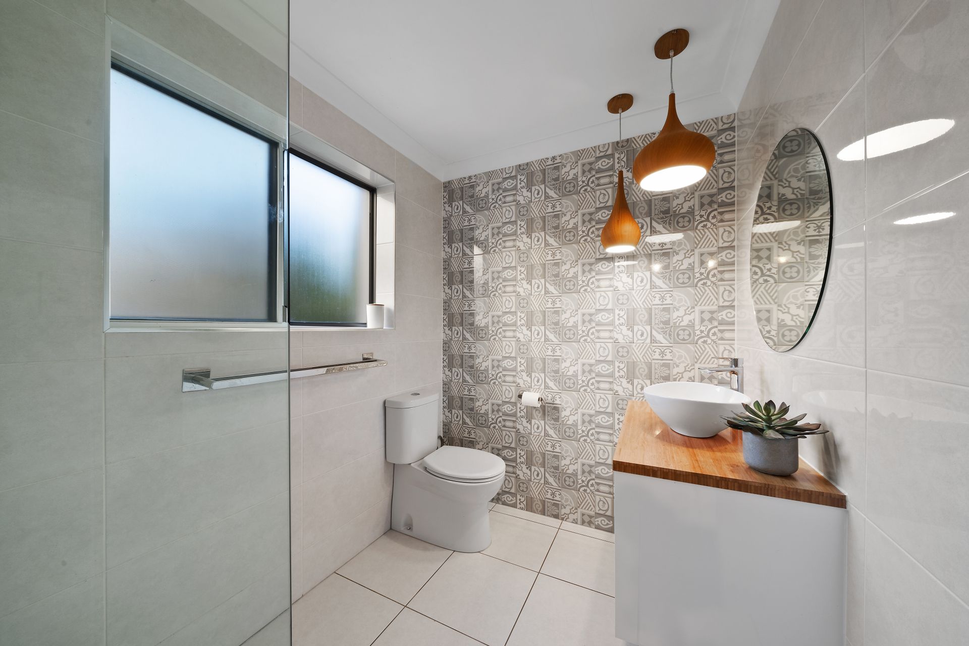 > The second bathroom located on the entry level features chic floor-to-ceiling tiles, shower with large raindrop showerhead, single basin vanity with plenty of storage, frameless vanity mirror, pendant lighting, extractor, towel rack, sliding window and toilet.