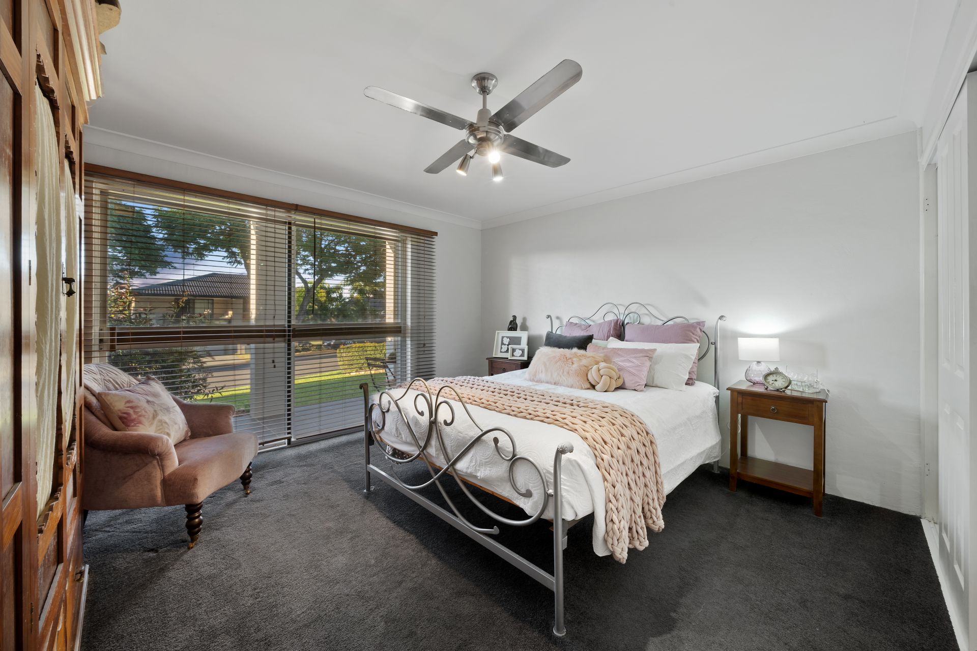 > Located on the entry level bedroom 4 enjoys built-in-robe, carpet flooring, ceiling fan with in-built lighting, venetian blinds and large glass sliding door giving you access to the porch.