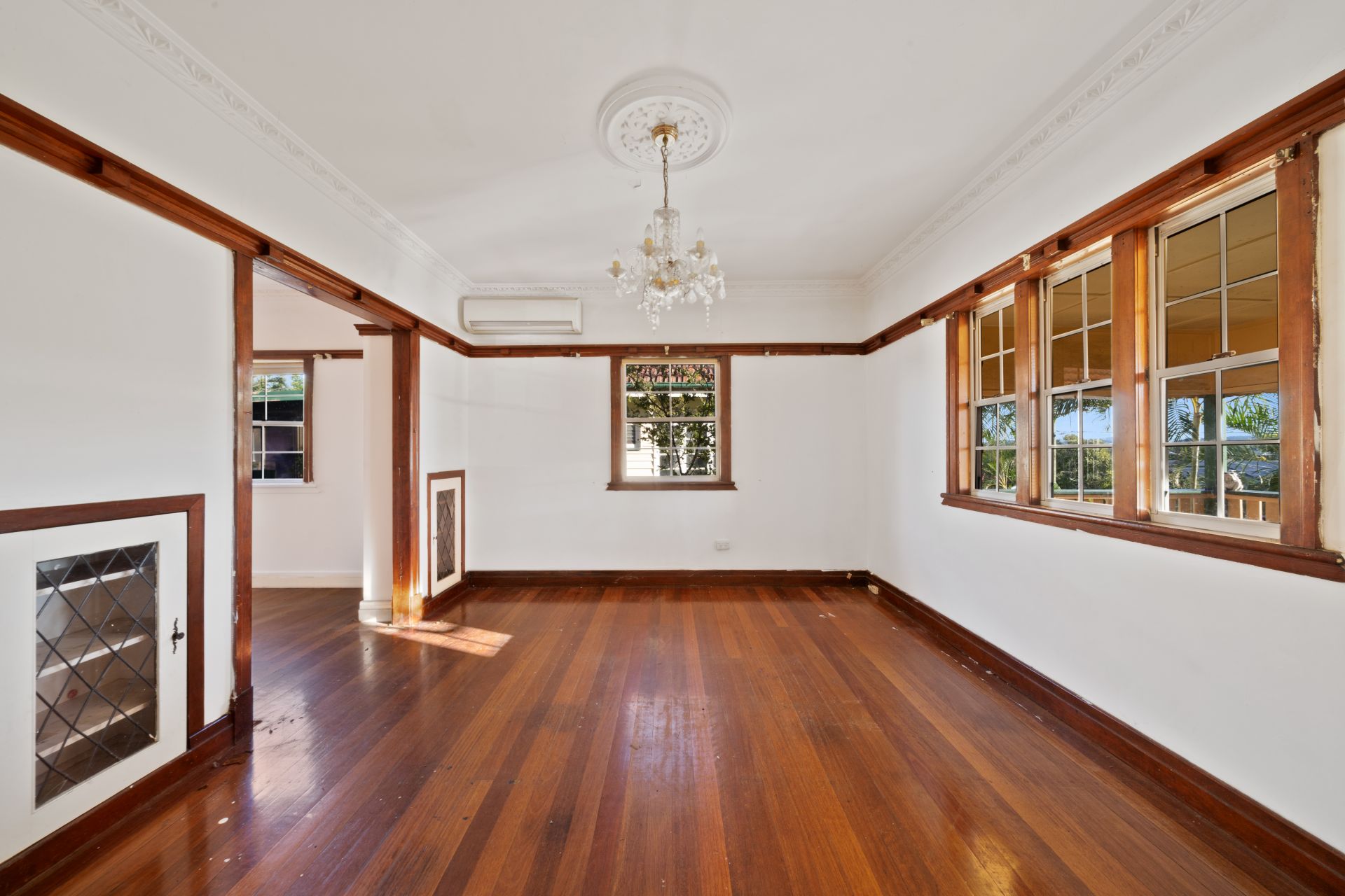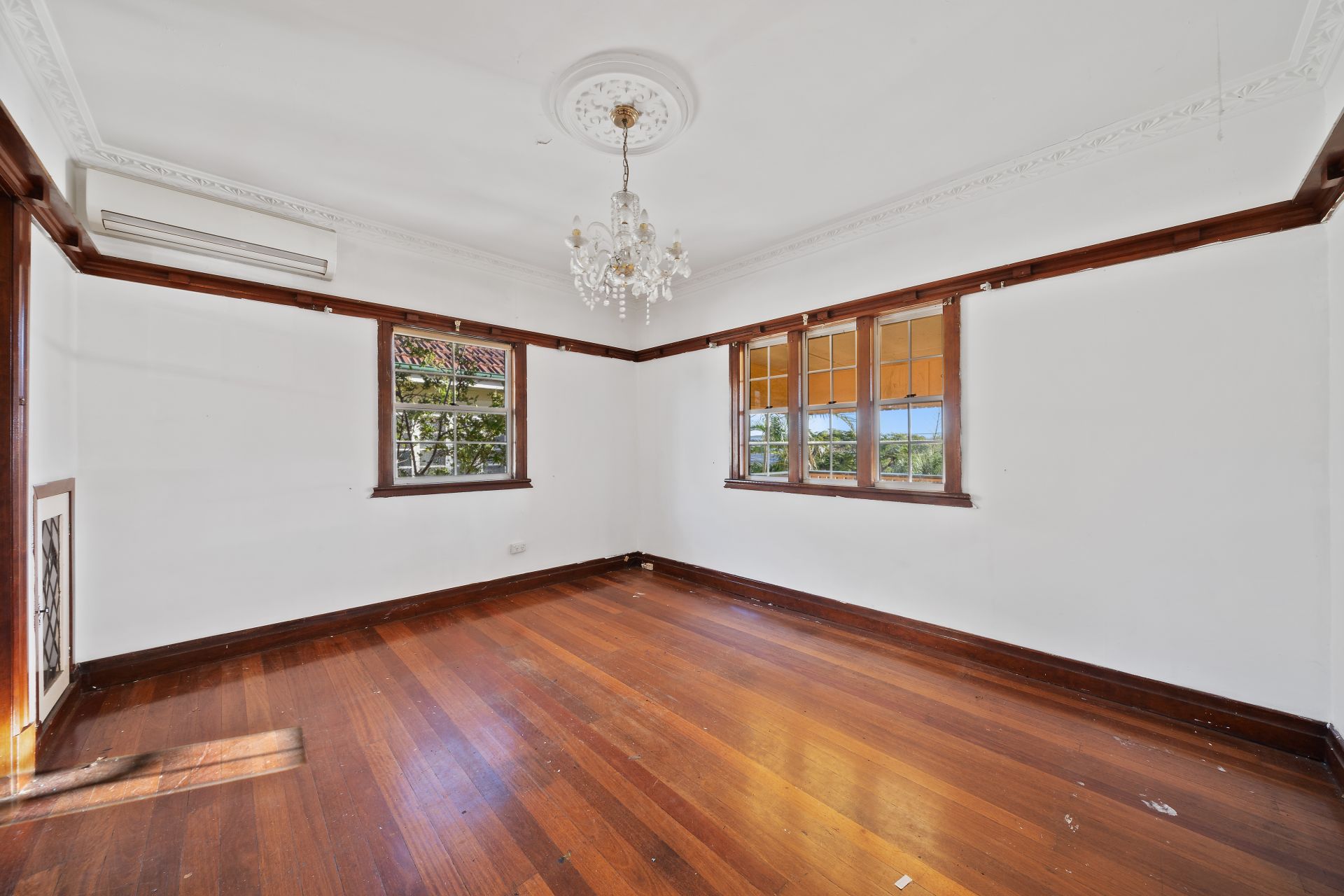 > The main living room's extra-high ceiling adds to the expansive nature of the home, boasting rich timber flooring, Toshiba split system air-conditioning, pendant lighting, ornate cornicing, sash windows and picture rails.