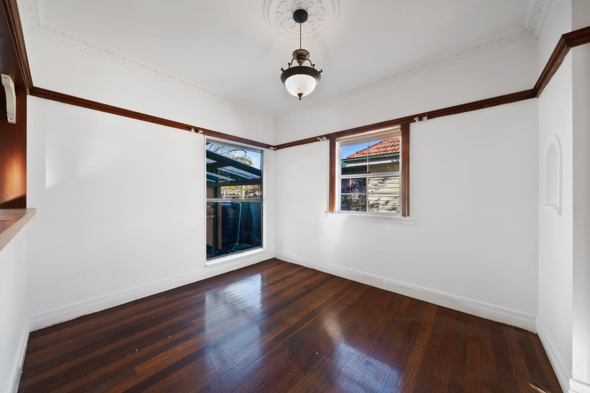 > The dining room boasts pass window to the kitchen, extra-high ceiling, ornate cornicing + ceiling work, pendant lighting, sash windows and rich timber flooring.
