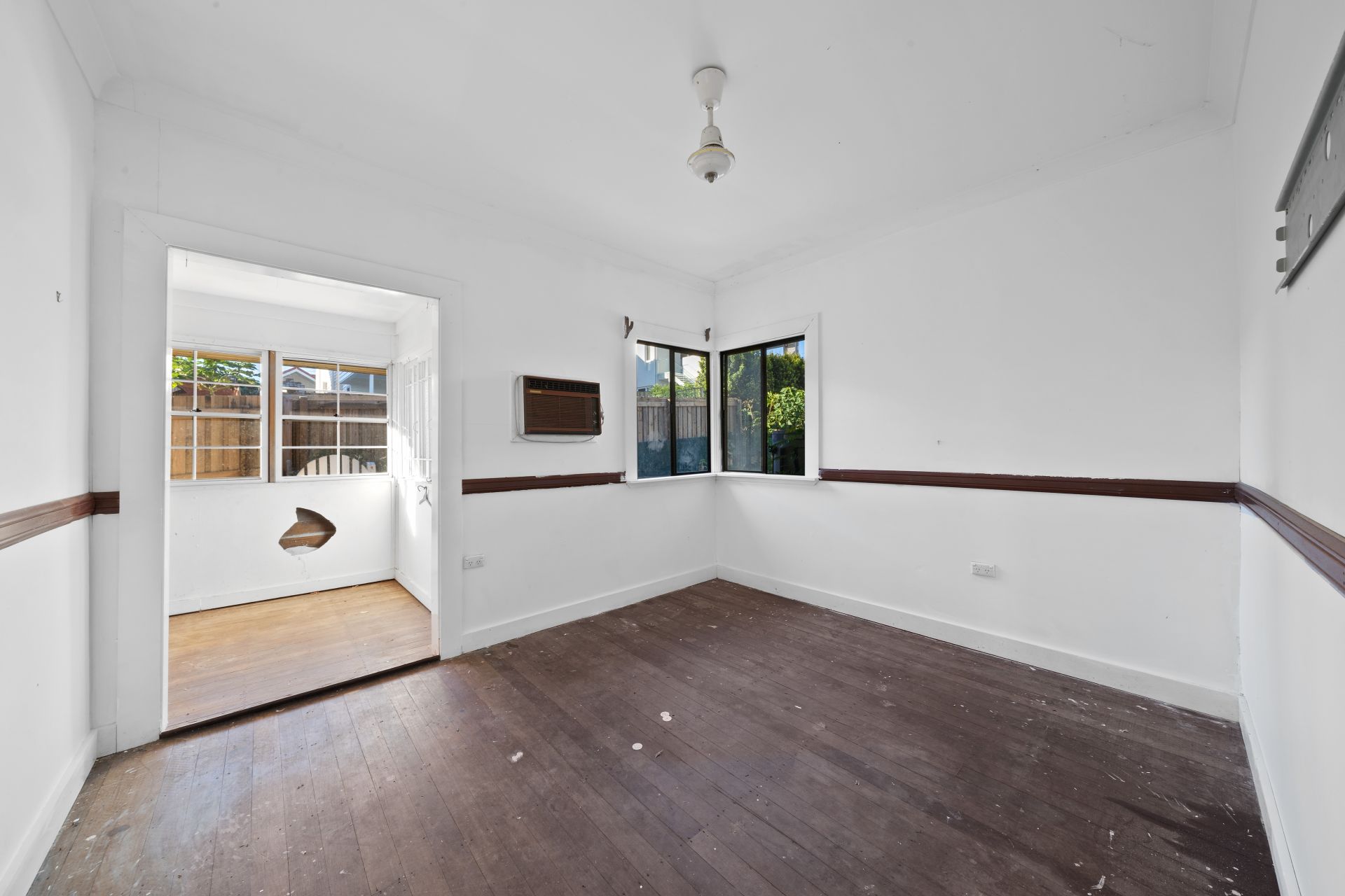 > Bedroom 2 features rich timber flooring, extra-high ceiling, combination of sliding + sash windows and study nook.