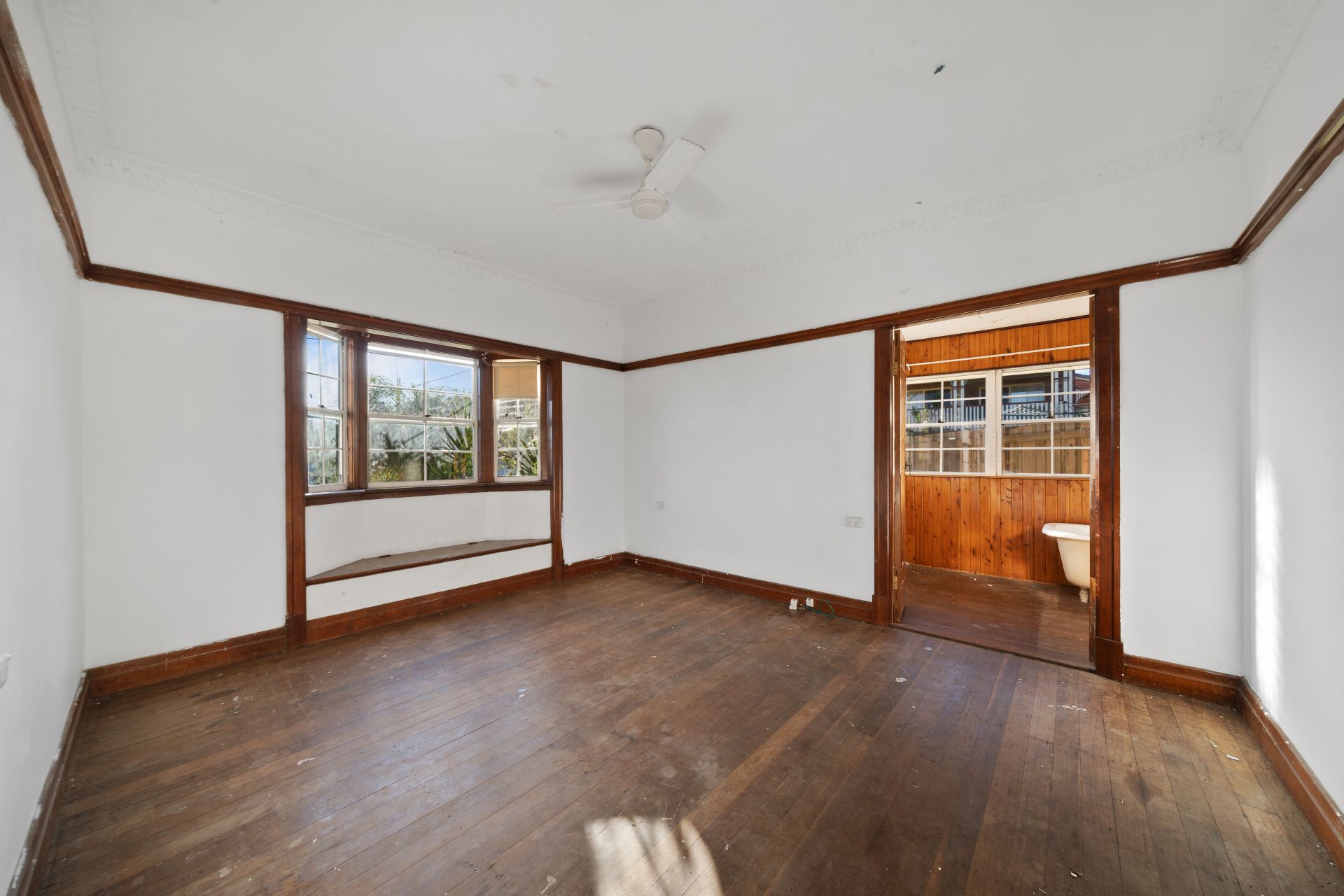 > The master bedroom features rich timber flooring, bay window, stained architrave + picture rails, extra-high ceiling, ornate cornicing, ceiling fan and access to the 2-way bathroom.