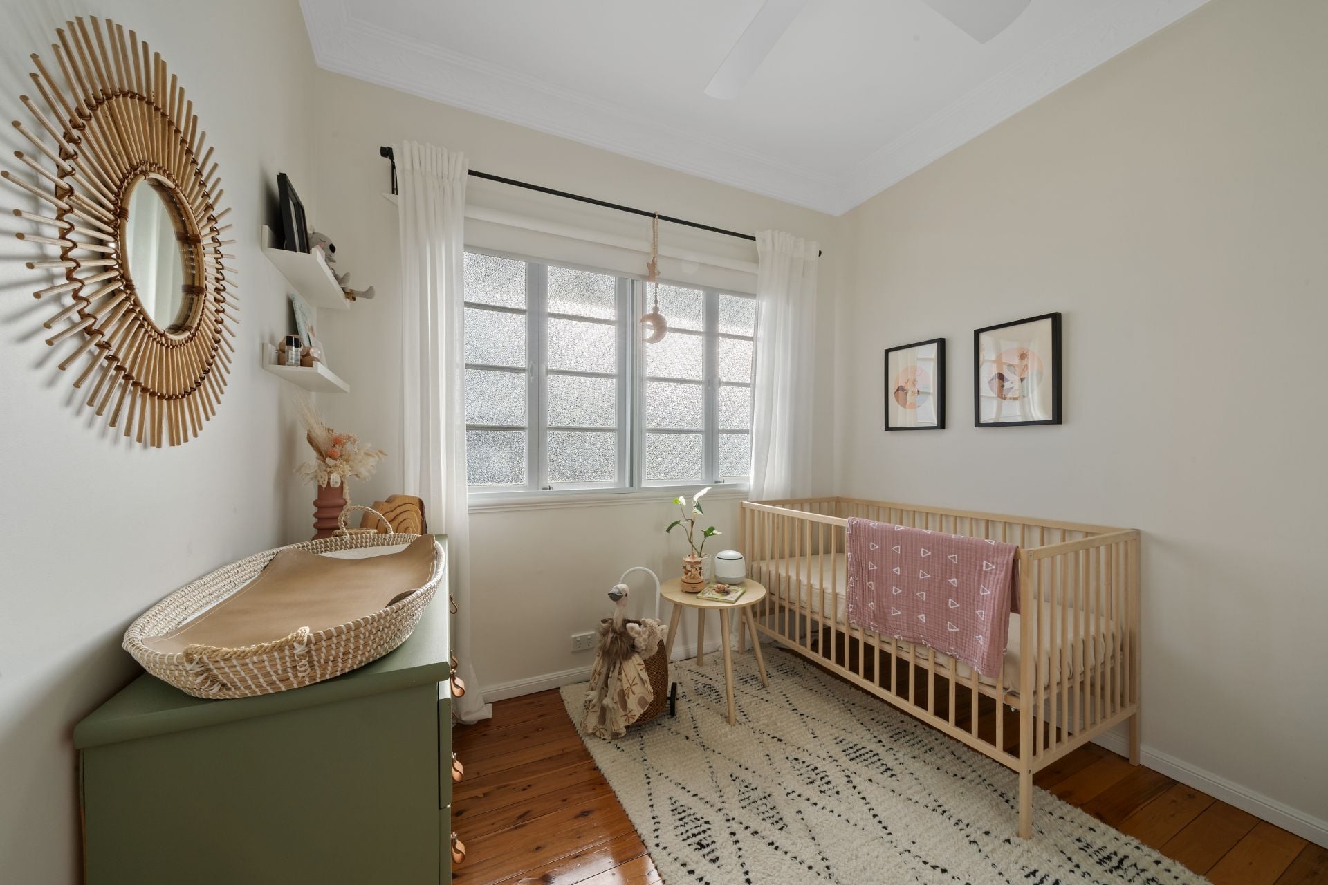 > Bedroom 4 features ornate cornicing, rich wood floors, casement windows, roller blinds + sheer curtains and ceiling fan with built-in light.