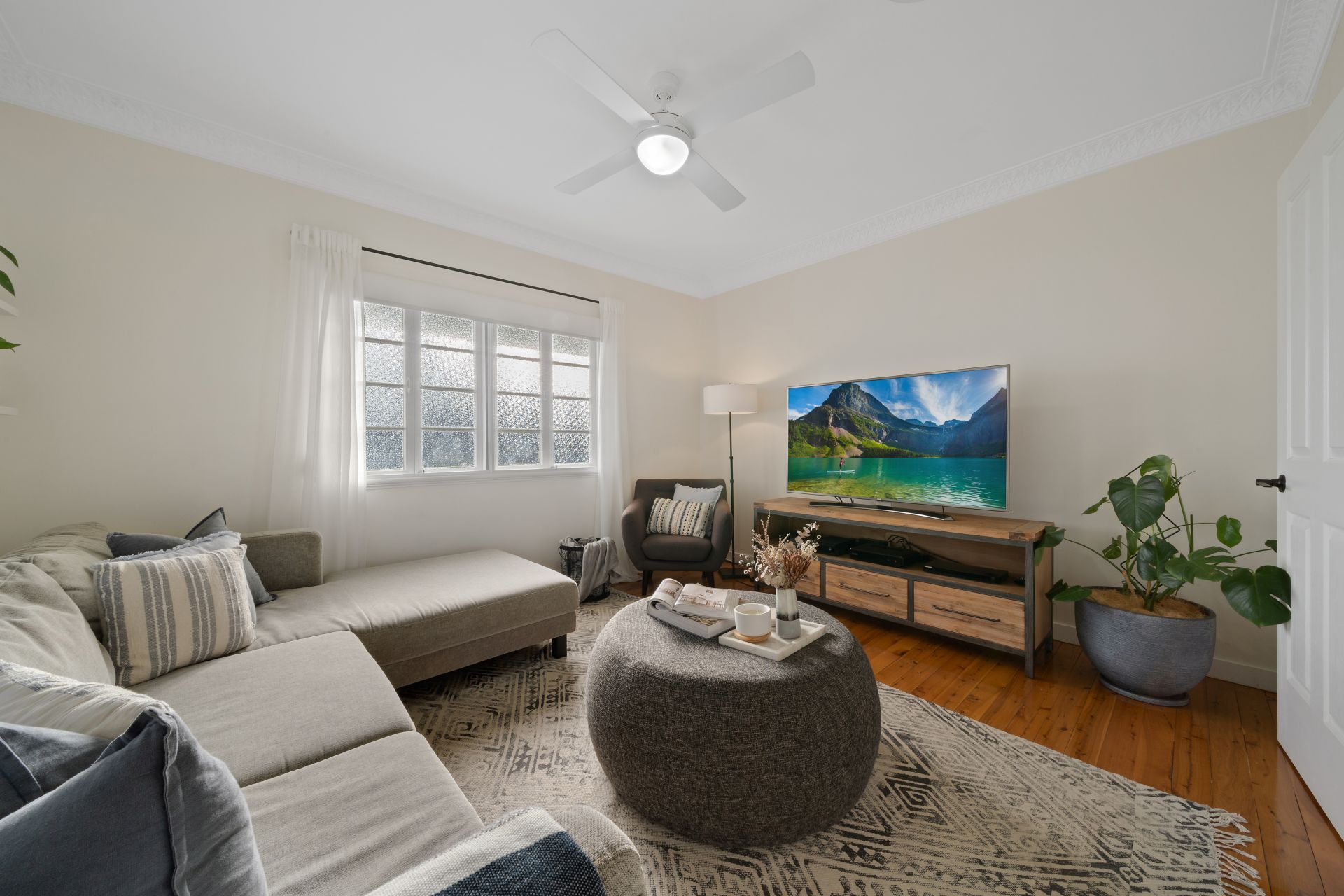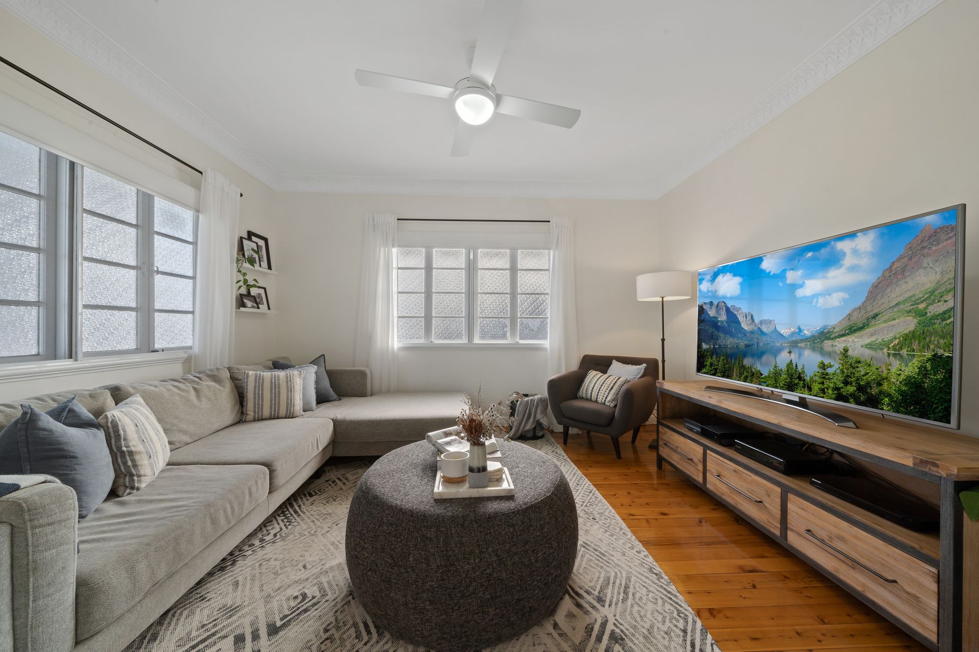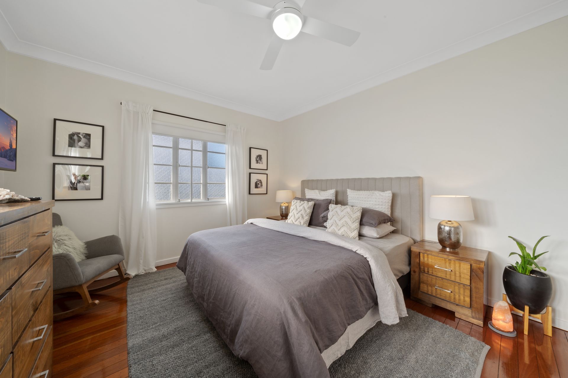 > The spacious master is bathed in natural light and enjoys rich hardwood floors, casement windows, roller blinds + sheer curtains, built-in robe and ceiling fan with built-in light.
