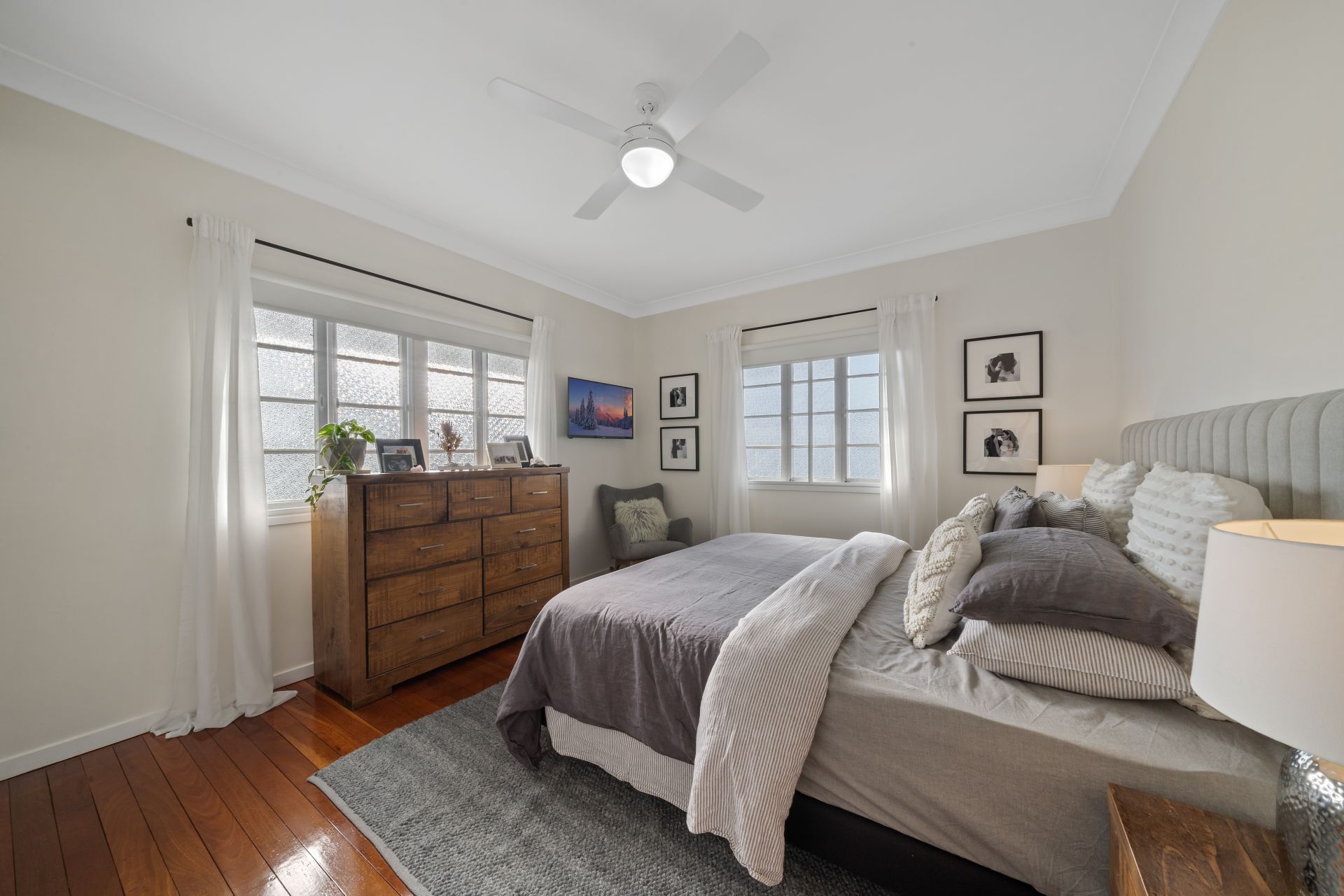 > Bedroom 2 features ornate cornicing, rich wood floors, casement windows, roller blinds + sheer curtains, ceiling fan with built-in light and built-in robe.