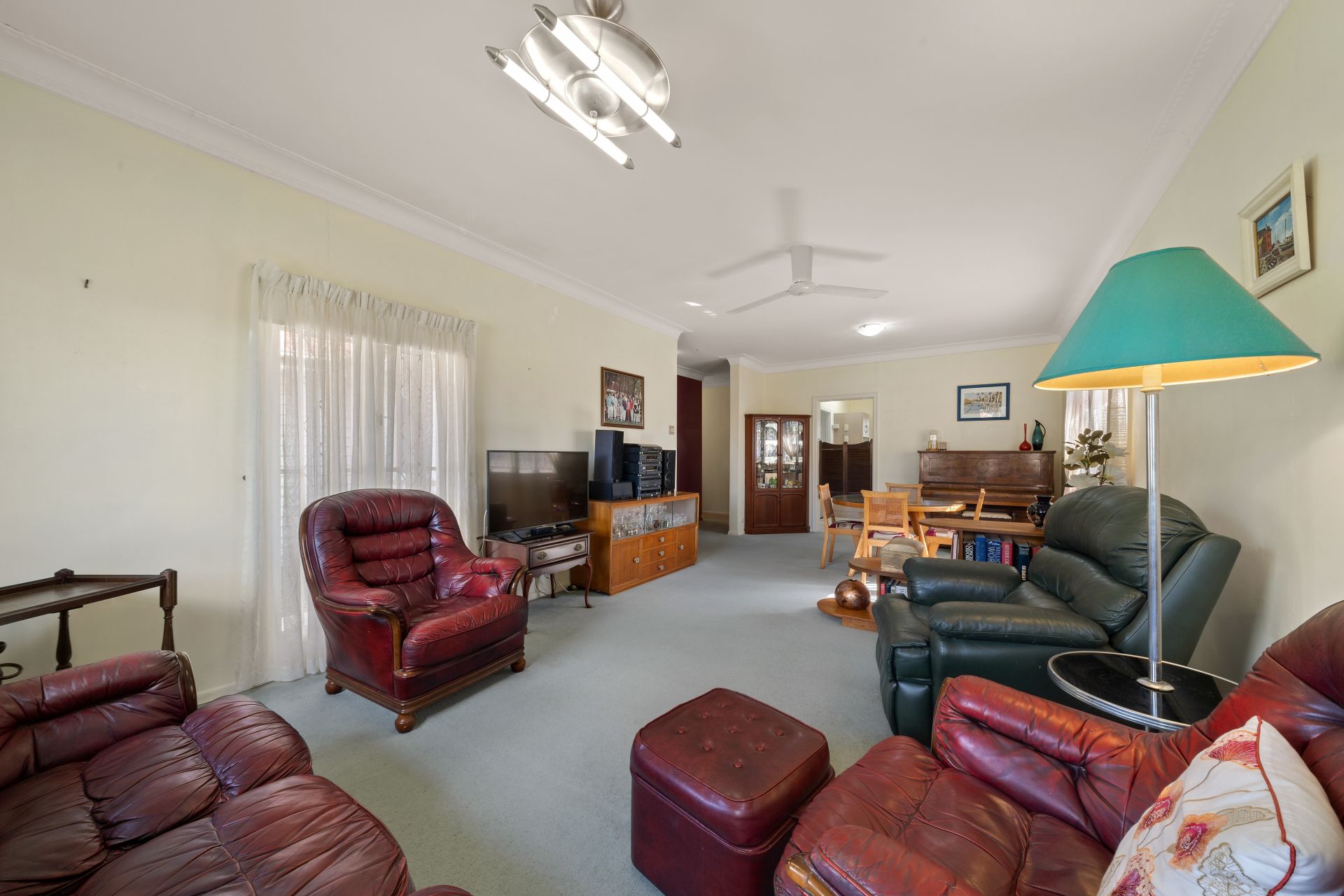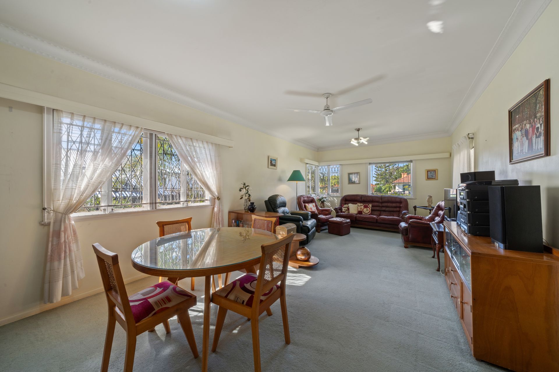> The lounge flows effortlessly to the kitchen/dining and through to the yard and outdoor entertaining area. Featuring carpet flooring, extra-high ceilings with ornate cornicing, casement windows, venetian blinds + curtains, ceiling fan and with access to the front landing offers a seamless flow of living space.