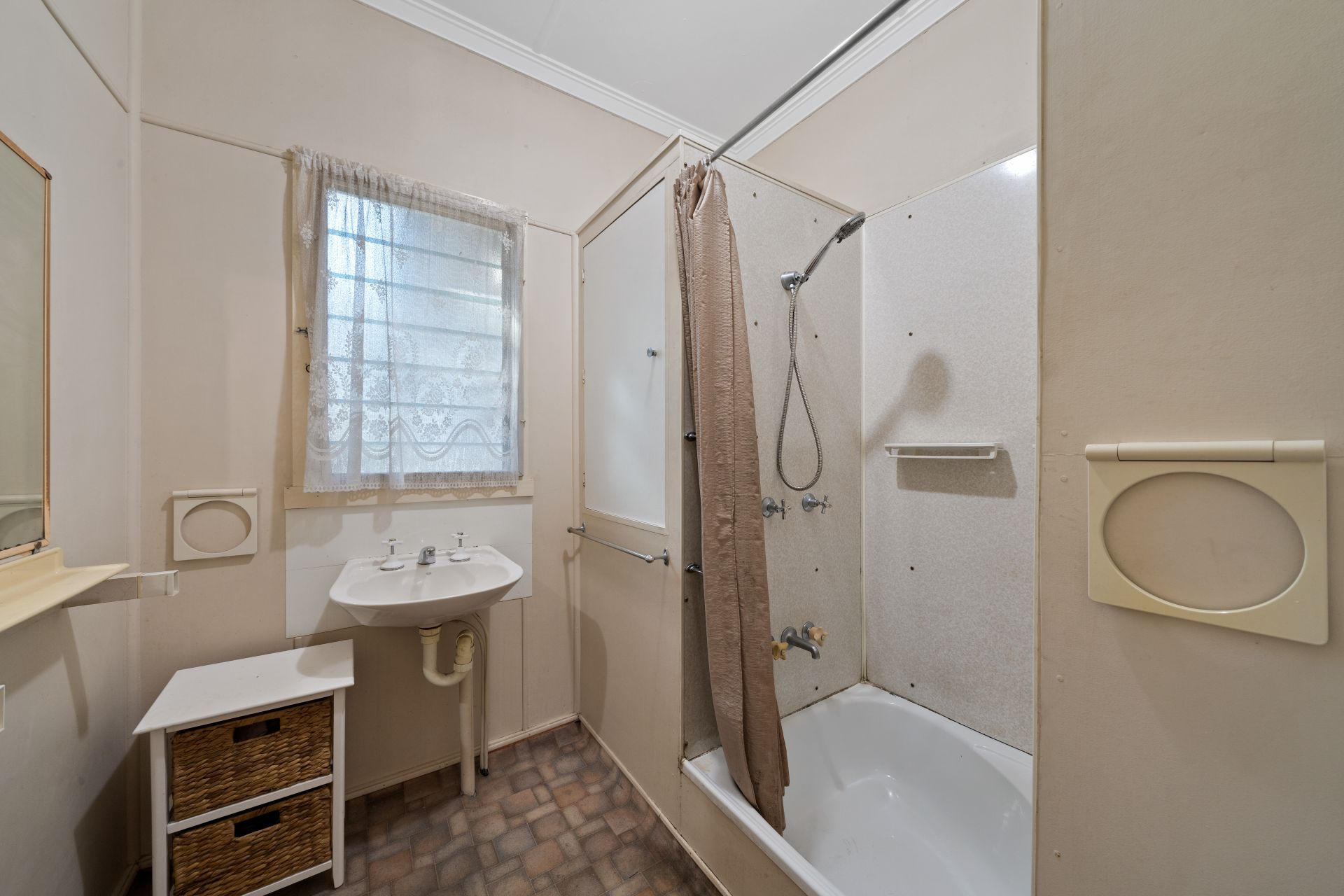 > The main bathroom located in the heart of the home features a shower over half-bath configuration, detachable showerhead, single basin vanity, vanity mirror, towel rail, hand towel rail, light/extractor, cupboard, and separate toilet.