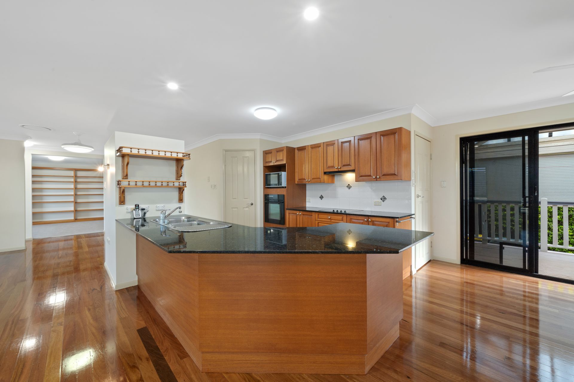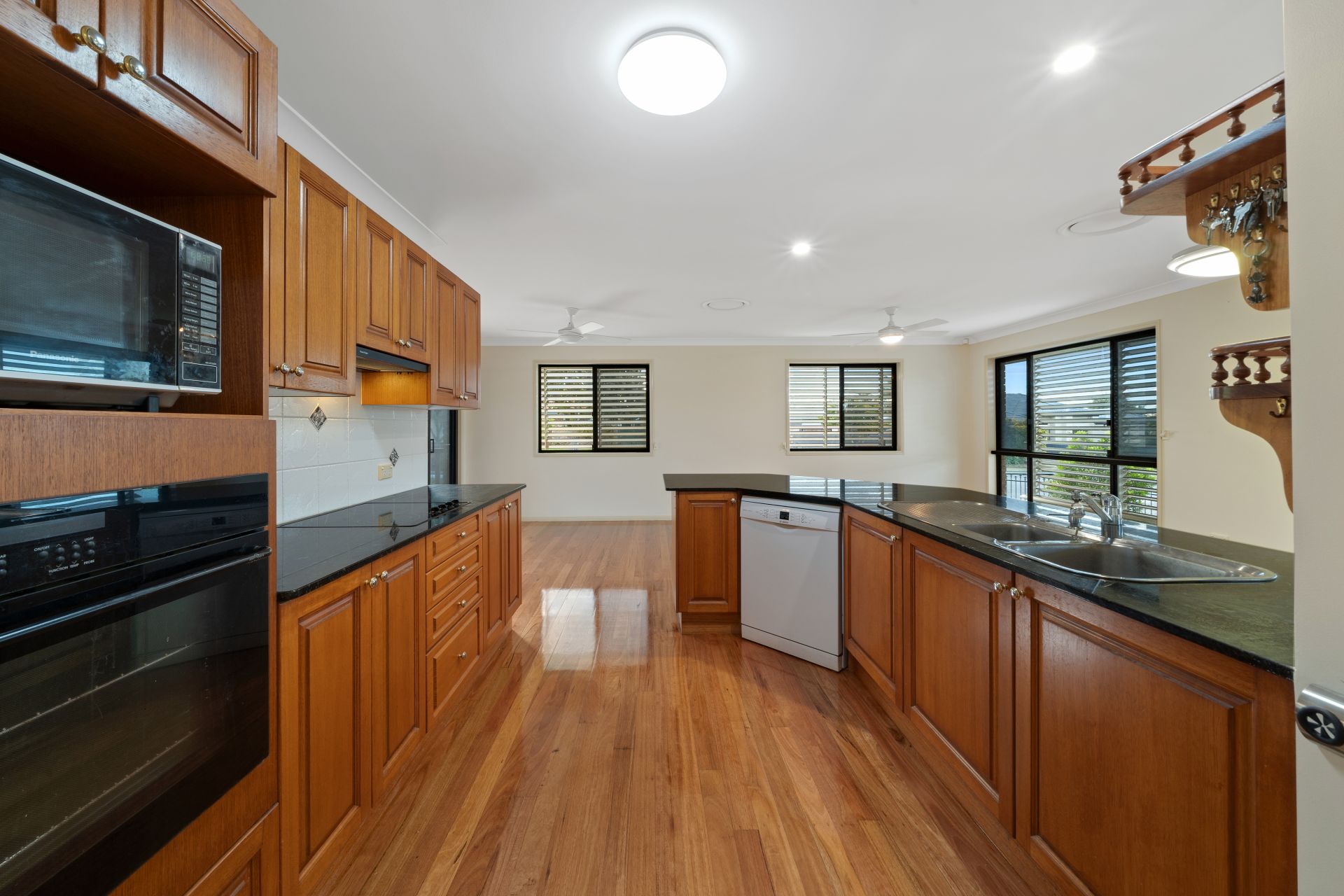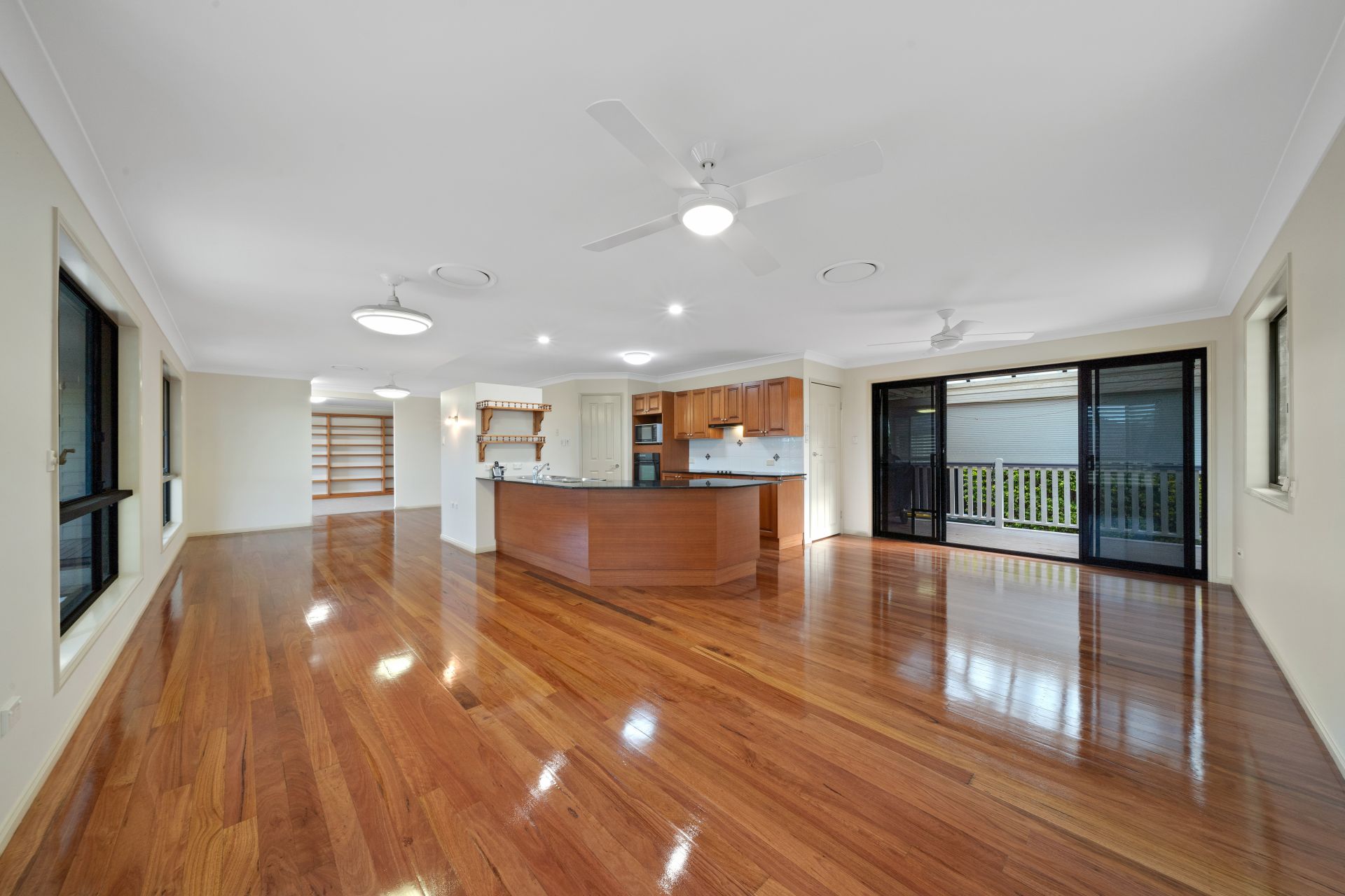 - Living and dining rooms share a large open plan with the homes kitchen. This light-filled room features polished timber flooring, ducted air-conditioning, ceiling fans and access to the covered rear balcony.