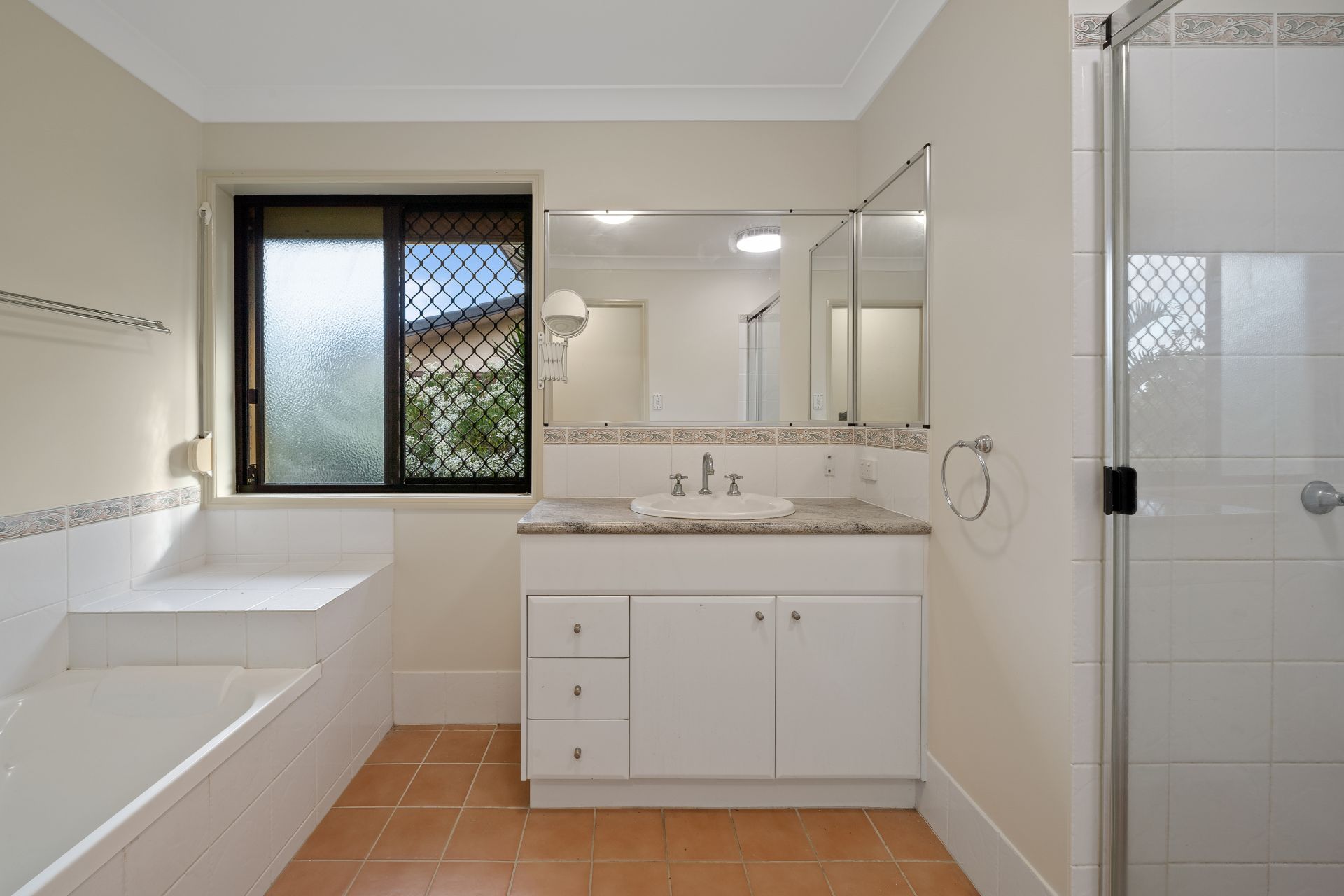 - Bathroom one is the homes main bathroom and features tiled flooring, large shower, bath, single vanity and separate toilet with additional vanity.