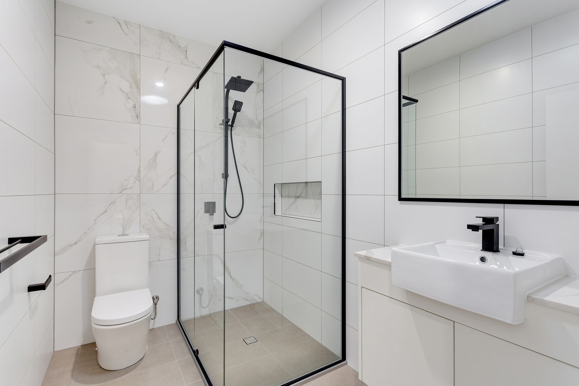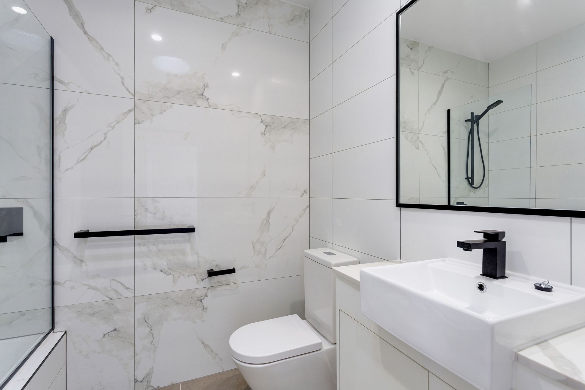 - Master bedroom features a luxury ensuite with floor to ceiling tiles, designer black fixtures, single vanity, large black framed mirror, rain shower head & handheld rose, black towel rails and soft-close toilet