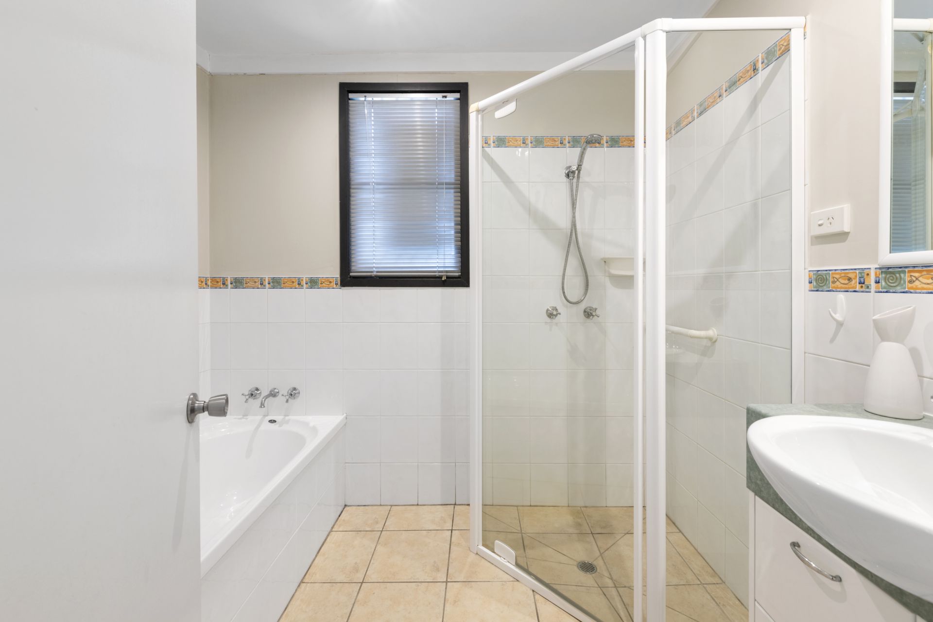 - Bathroom one is the homes main bathroom featuring tiled flooring, shower, separate bath, single vanity and separate toilet.