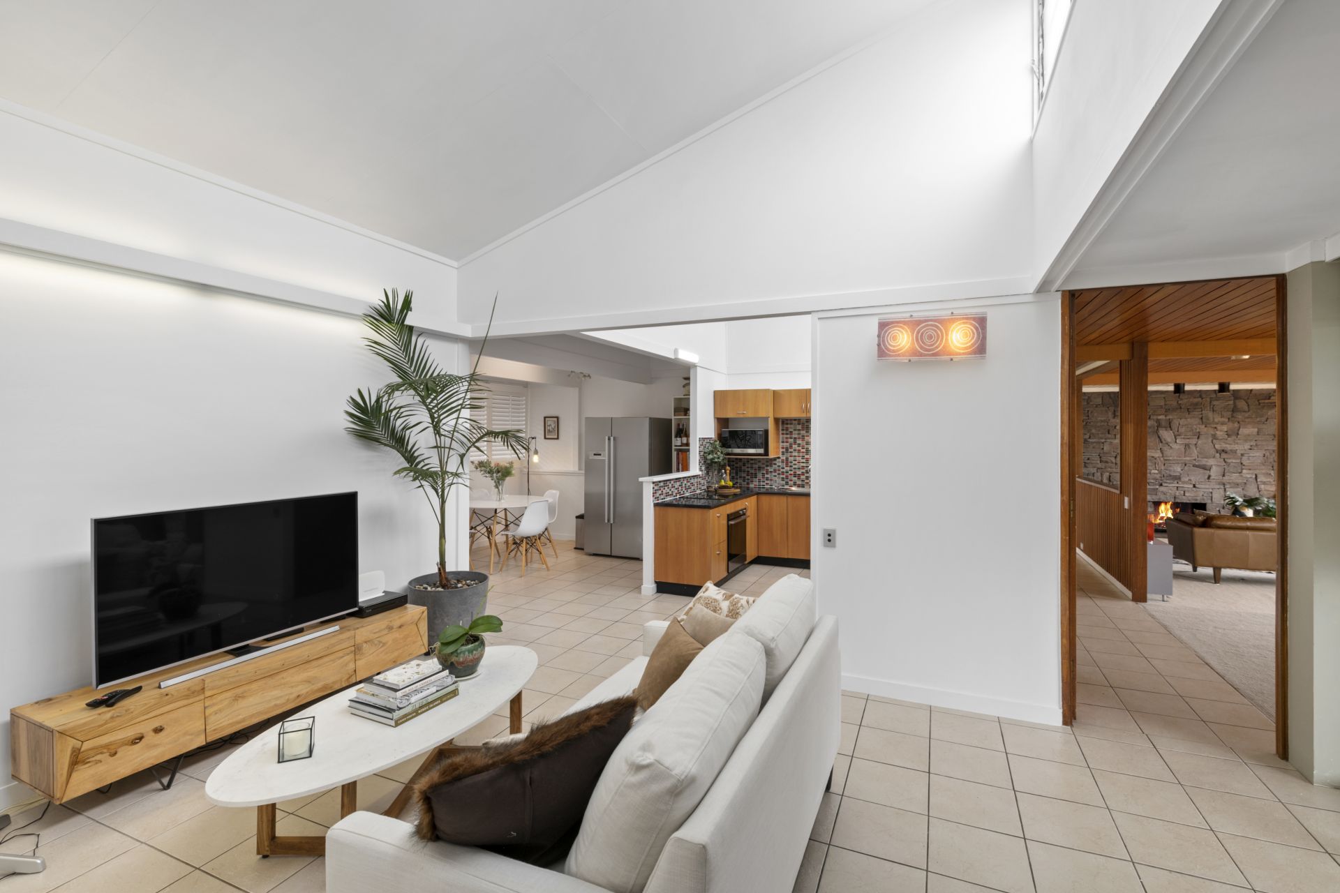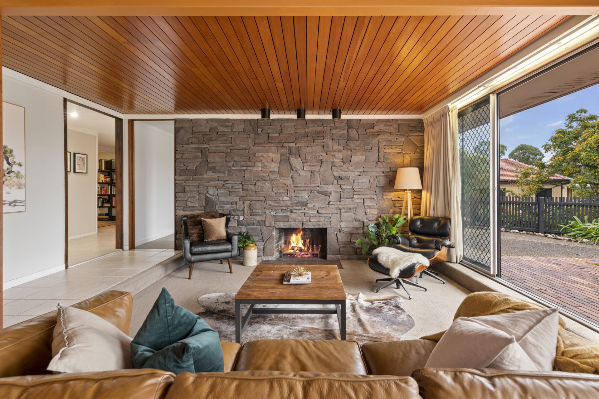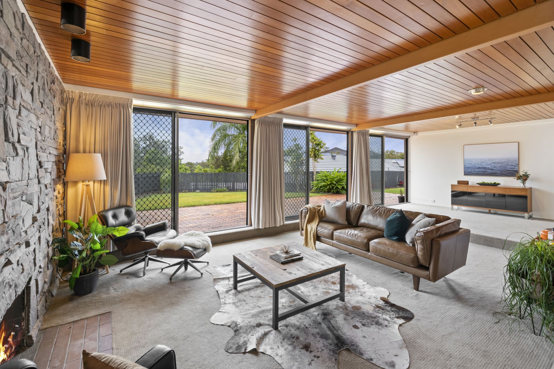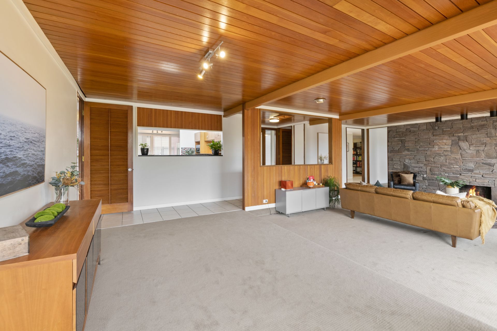 - The sunken lounge and formal dining room share a large, combined space with huge glass sliding doors and windows to capture the natural light from the homes elevated position and would be perfect for large gatherings and entertaining. This large room features 2.6m high slatted timber ceiling, carpeted flooring, open wood burning fireplace surrounded by a genuine stacked stone feature wall and access to the yard and outdoor entertaining area .