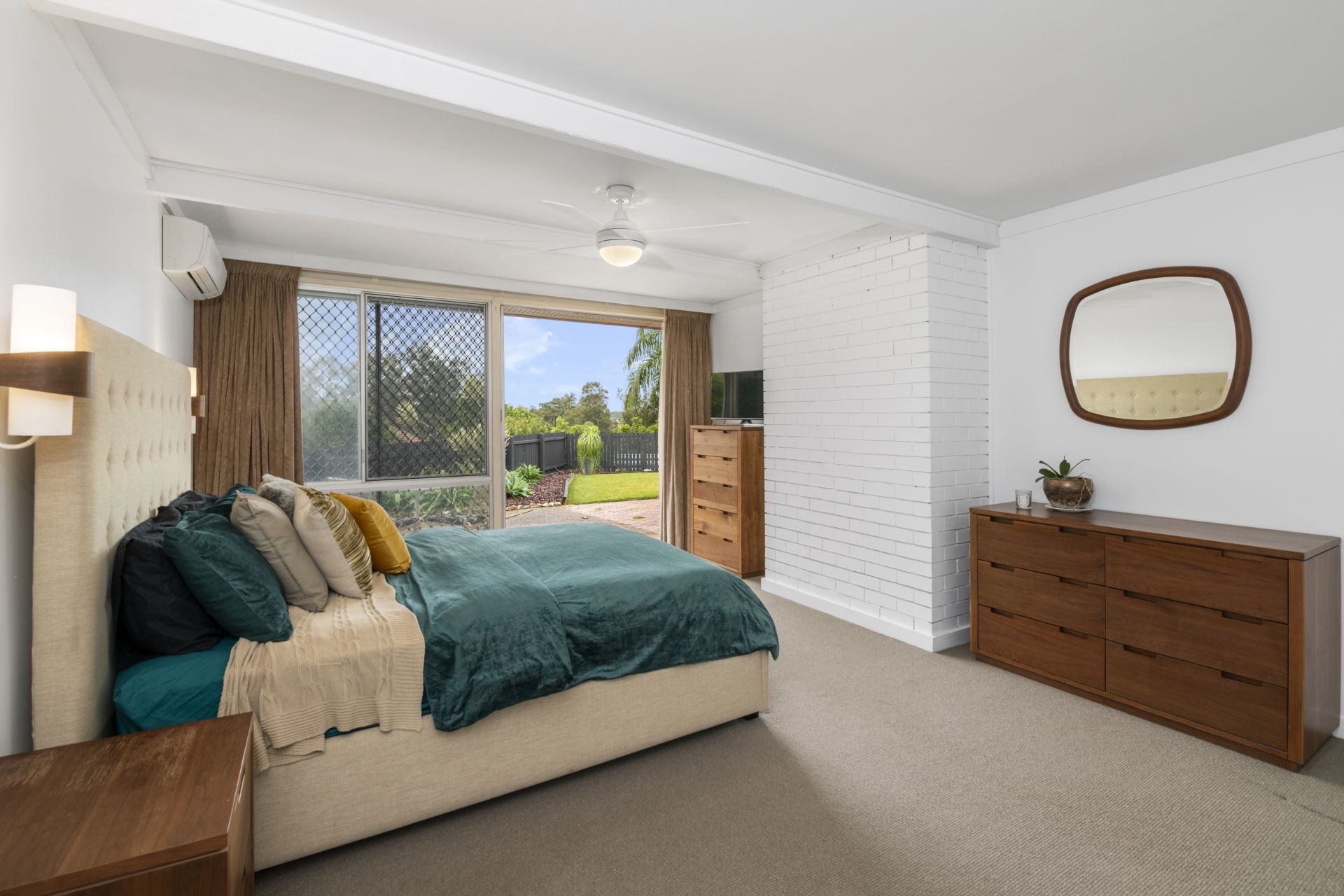 - Bedroom one is the homes large, light filled master-bedroom featuring carpeted flooring, ensuite, walk-in-wardrobe, split system air-conditioning, ceiling fan and access to the yard and outdoor entertaining area.