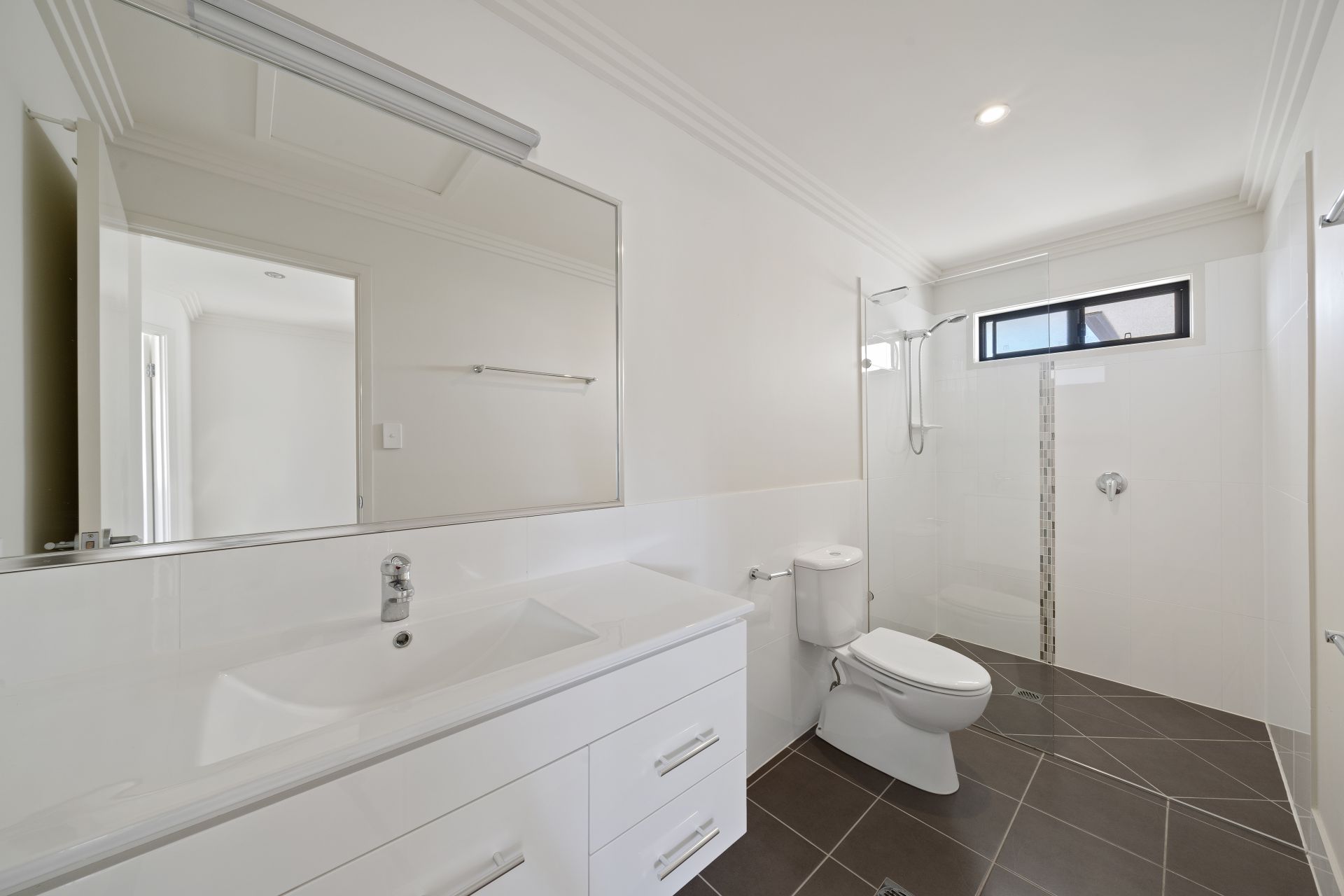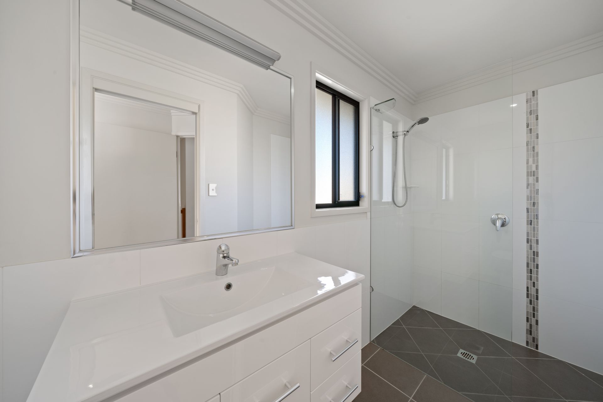 > The main bathroom features single basin floating vanity with plenty of storage, framed vanity mirror, dual towel rails, frameless walk-in shower with detachable shower head and toilet.