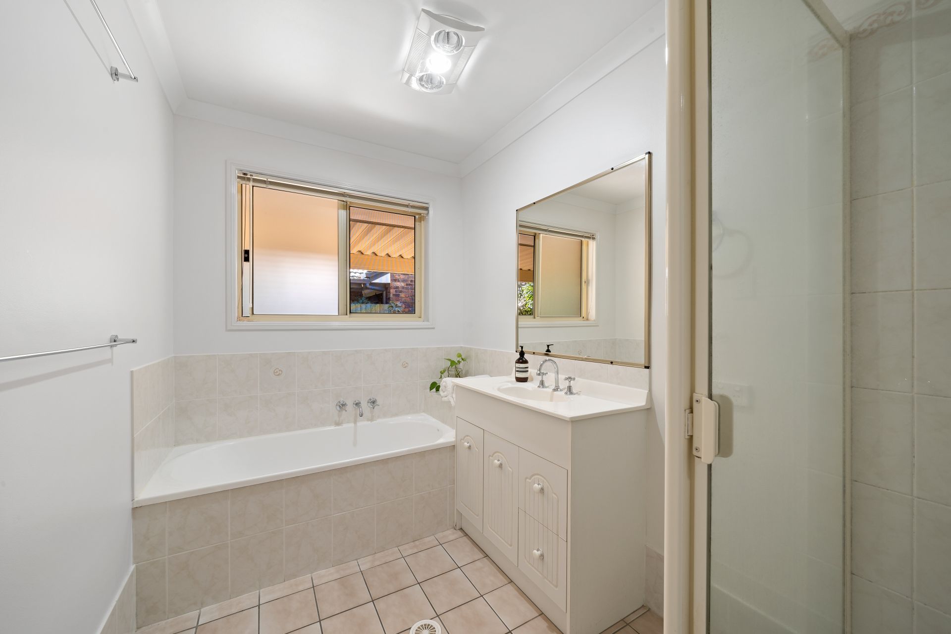 > The main bathroom features a shower, bath, single basin vanity with plenty of storage, large framed vanity mirror, towel racks, hand towel rack, light/extractor combo, venetian blind and separate toilet.