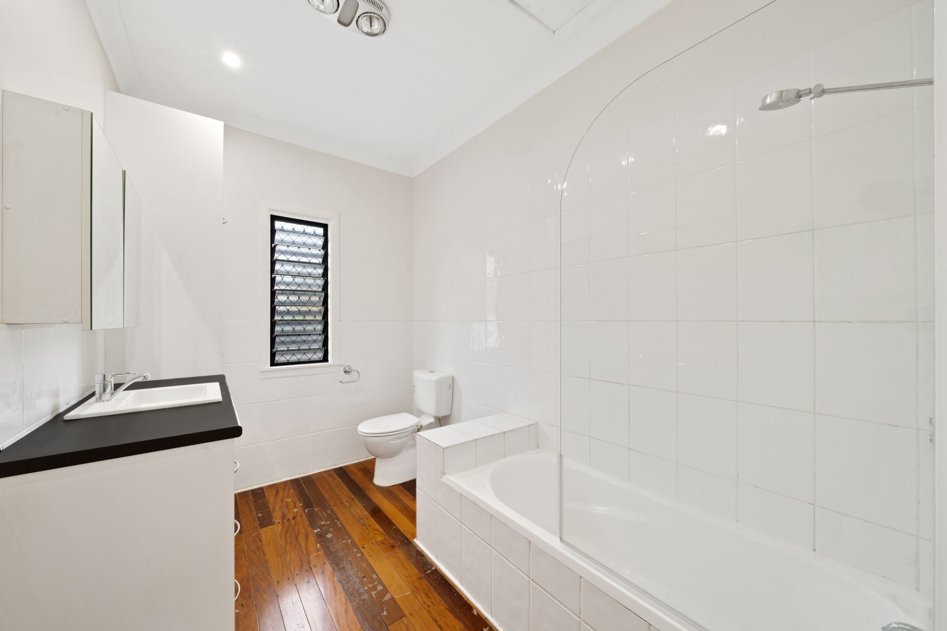 - The modern bathroom features a crisp clean design and warm polished timber floors. Loads of storage with a separate linen closet and vanity with storage. The shower over the bath is complemented by the combo exhaust fan with a heat lamp.
