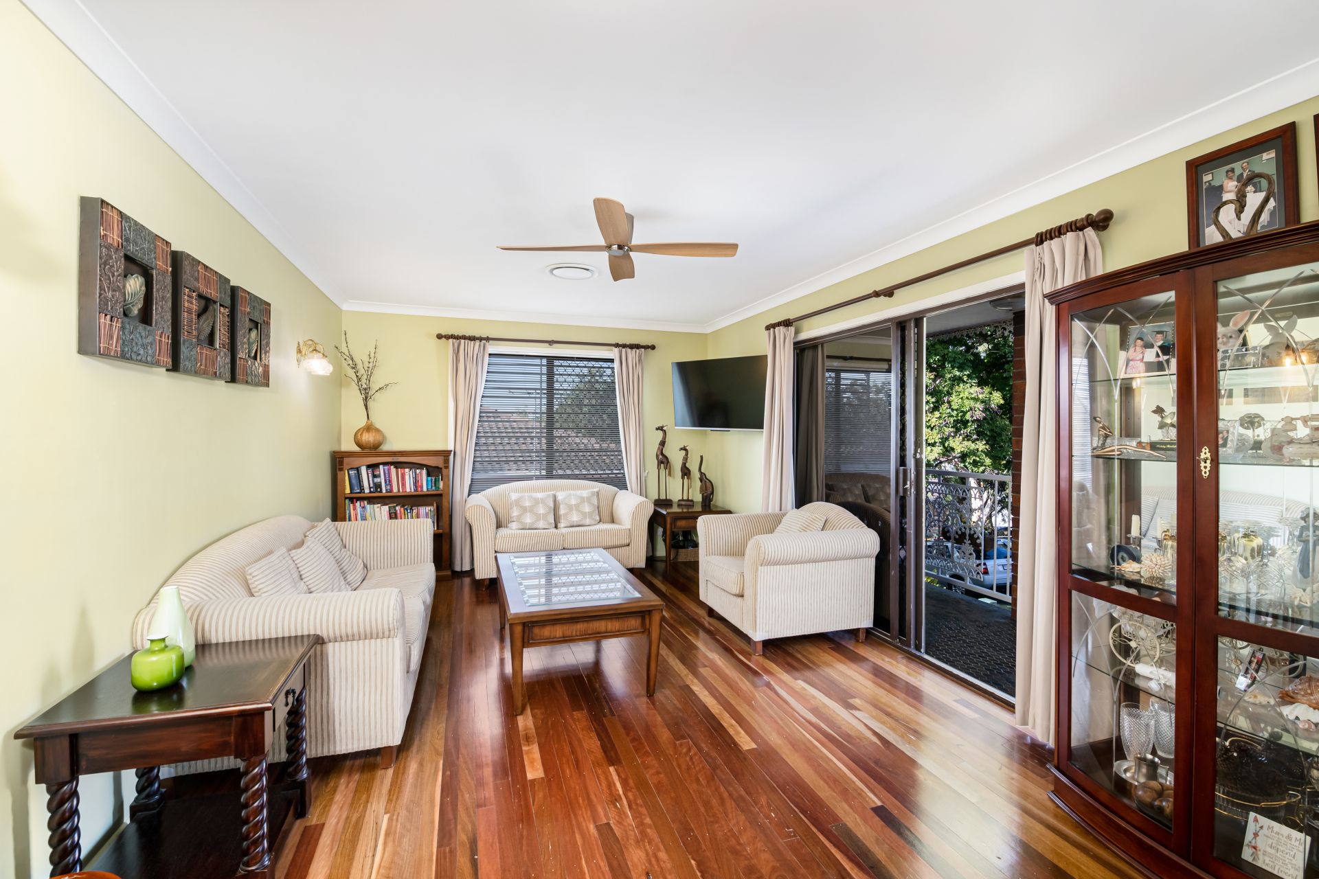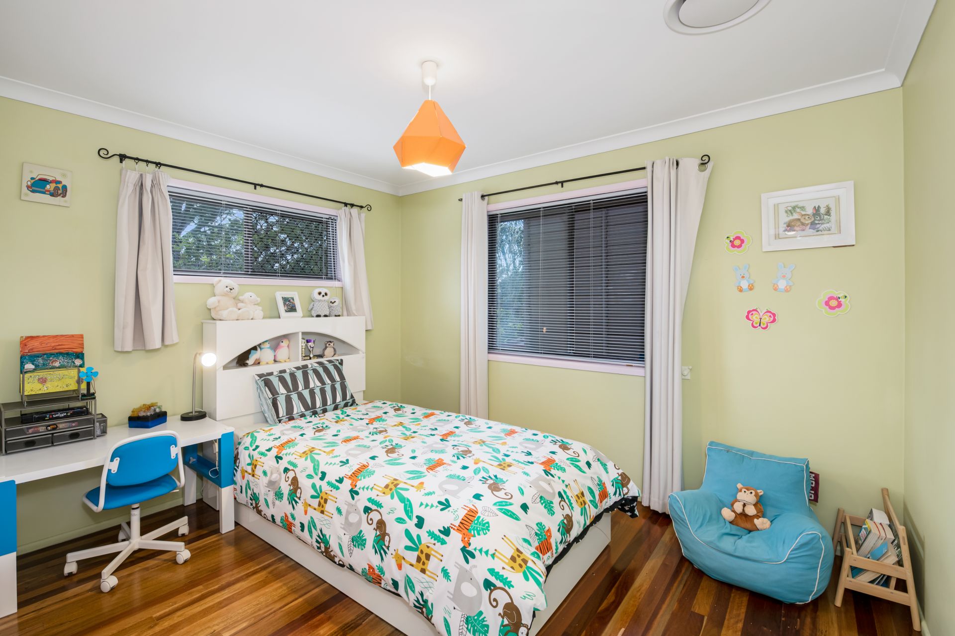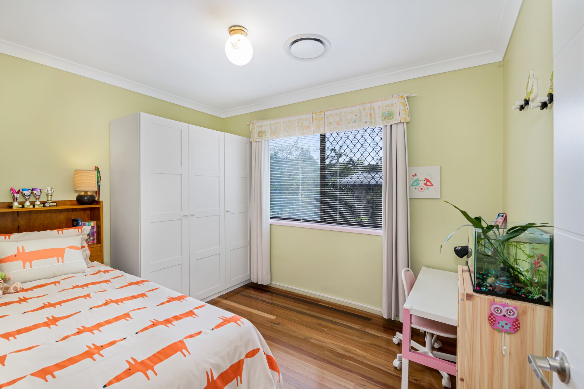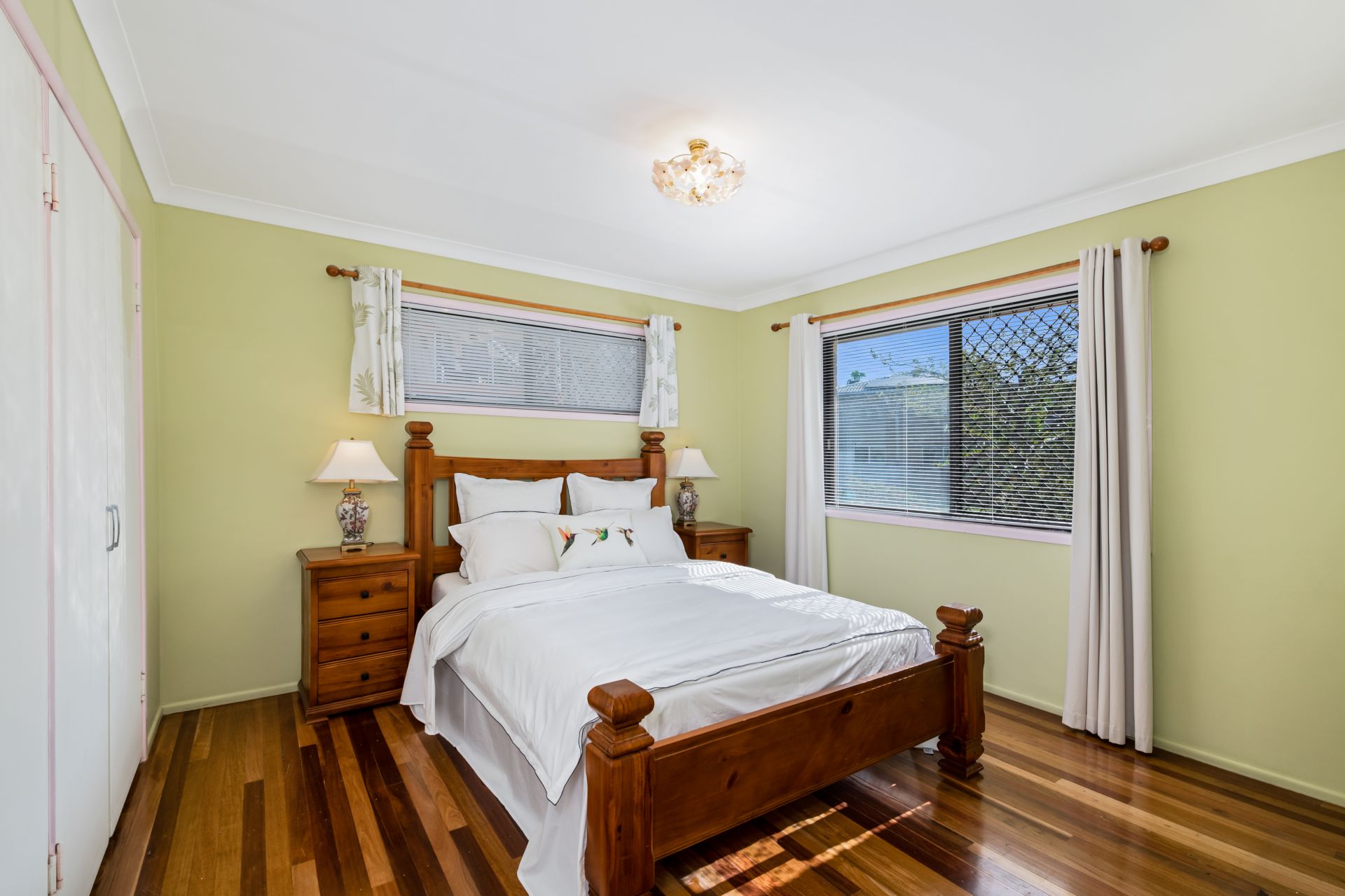- Bedroom one is the homes master bedroom. Overlooking the quiet, tree-lined backyard, this great-size room features polished timber flooring, ducted air-conditioning, and built-in robe.