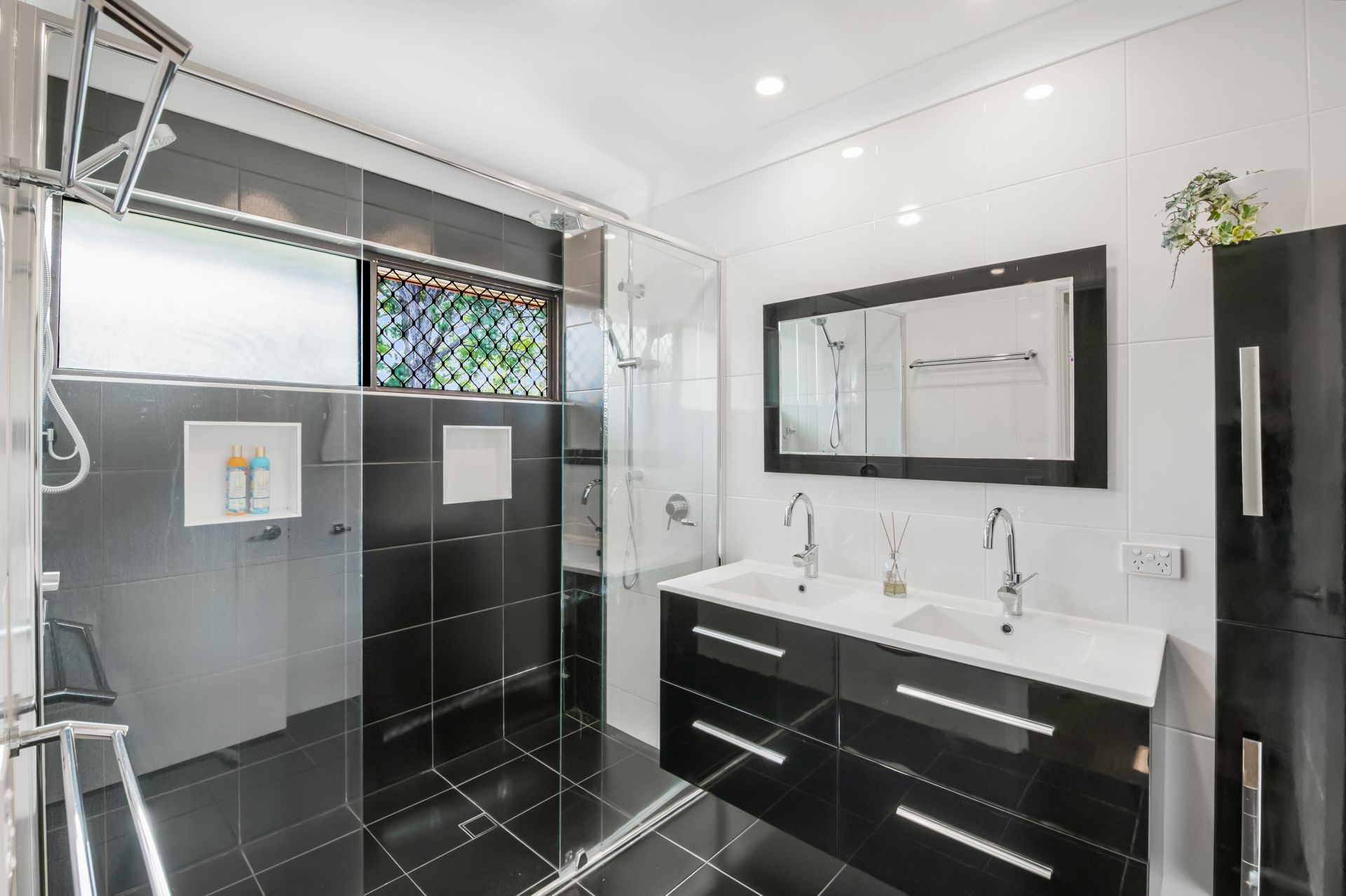 - Bathroom one is the homes fully renovated main bathroom, featuring floor to ceiling tiles, double shower plus third rainfall showerhead, double vanity with soft close draws and separate toilet.
