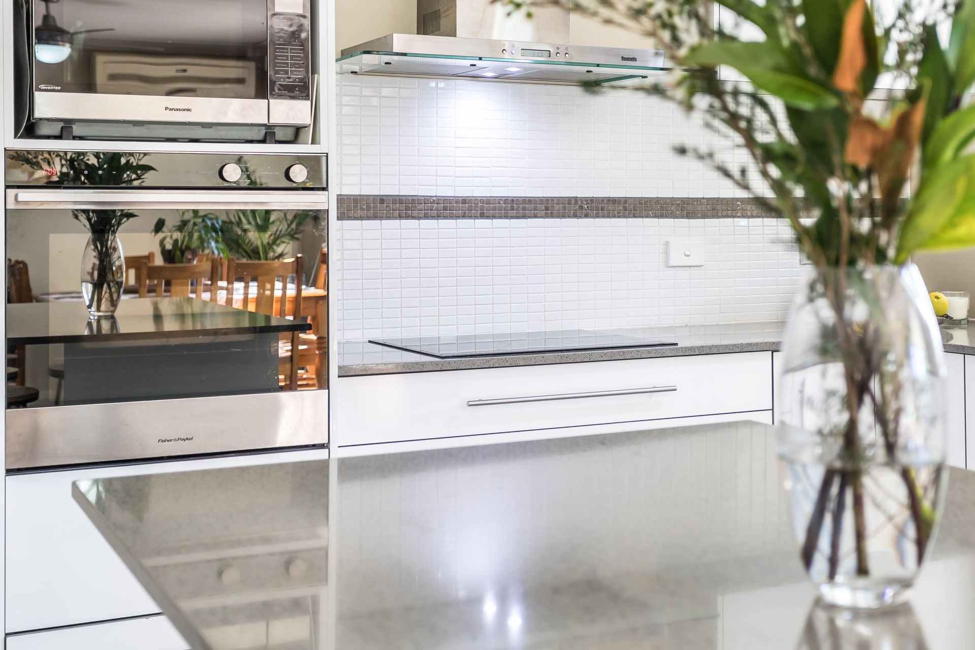 - Modern kitchen with Caesarstone benchtops and stainless-steel appliances