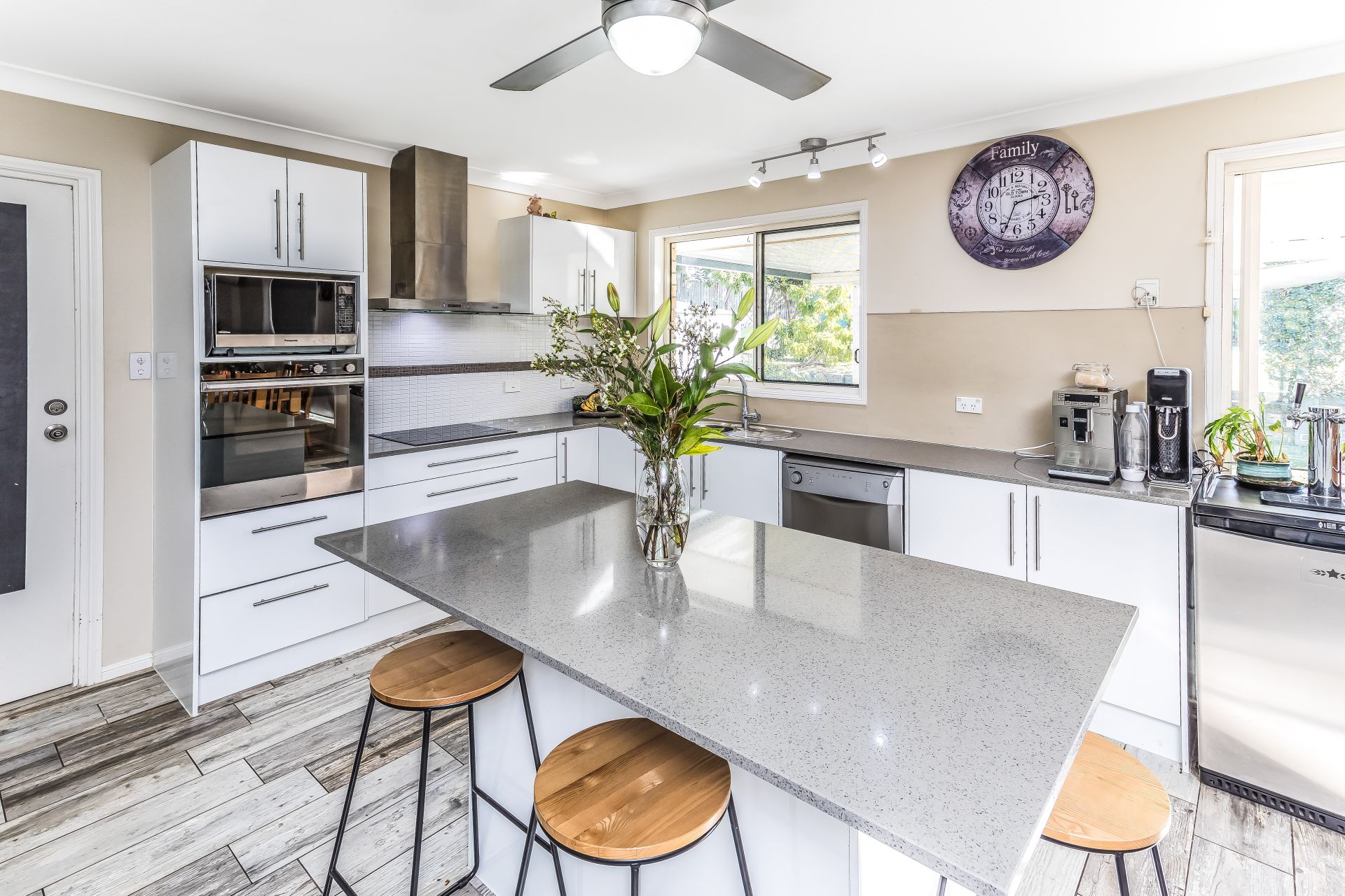 - Functional kitchen with island bench, Caesarstone benchtops, stainless-steel appliances including dishwasher, electric cook top and ample storage and bench space