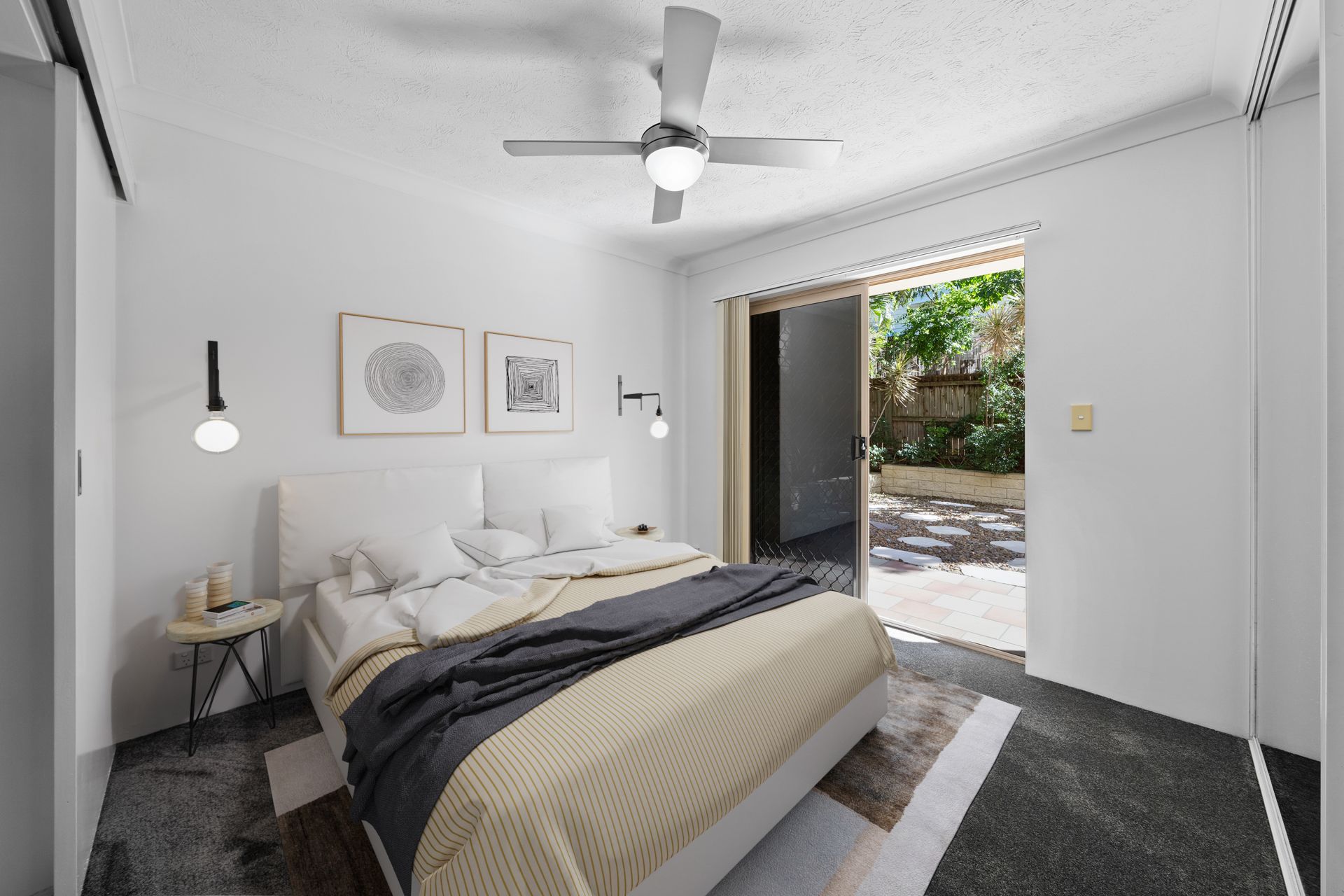 The additional bedroom features new carpet, ceiling fan, security screen, access to the second balcony through the sliding tinted glass door and a built-in mirrored wardrobe